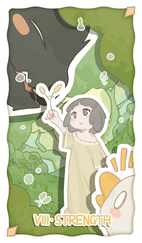 The girl stands in the jungle, representing vitality and energy. Her expression is relaxed and calm. She twirls the foxtail grass in her hand, enticing the giant beast before her—this symbolizes overcoming strength with gentleness, patience and control. The duck watches them with a frightened expression. The beast’s emotions gradually settle, drawn by what’s in front of it, and it slowly approaches the girl to sniff the object in her hand. This also implies balancing control. The girl’s loose long robe represents courage and confidence.