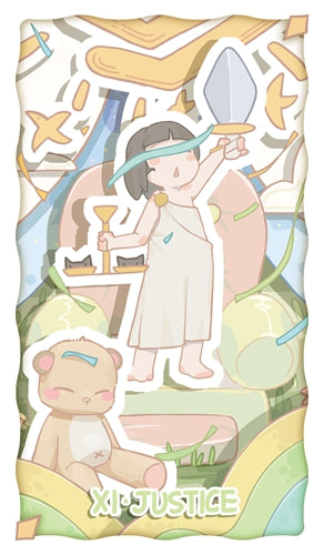 The girl stands on a platform with her left hand raising the sword upward—this represents the determination and strength to be just, and also suggests the duality of the matter itself. She holds a scale in her right hand, indicating evaluation and weighing, pursuing an objective attitude. The huge sun behind her is seen as the emotion in her heart: burning yet unwavering, representing light. The teddy bear in front of her symbolizes external desires and also reminds us that while maintaining fairness and justice we must constantly reflect upon ourselves and not be swayed by personal emotions.
