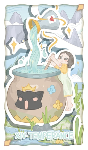 The girl stands on a stone block and uses a wooden stick to stir the liquid dripping from the holy cup above—this represents her blending material and spiritual elements. Stars continually shimmer around the mixture, symbolizing purification and healing. The flowing water in front of her signifies life and emotions. The triangle symbol on the cup denotes stability—solid and unshakable.