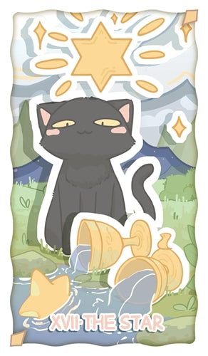 The cat overturns the sacred cups with a smug expression, symbolizing a return to simplicity and nothing hidden. The water that slowly flows from the overturned cup represents the source of life and the recovery and healing of emotions. The star above its head signifies the power of the universe and the pure soul of the spiritual world. The water gathering into a small pool embodies the interaction between the conscious and subconscious. The star reflected in the water represents establishing a connection between them.