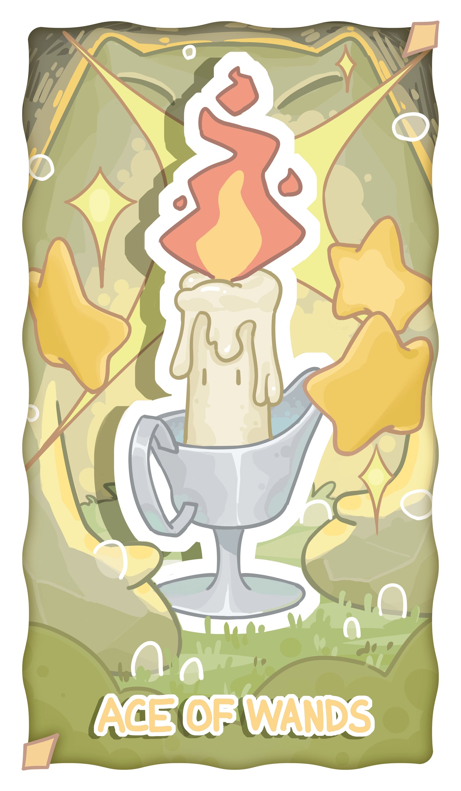 The lit candle symbolizes the flourishing of life force and the start of an event. The surrounding stars represent inspiration and creative manifestation. A cat-eared figure embracing the candle embodies warmth and passion. The elemental energy of the spirit gently rises, layer upon layer surrounding it, like a ritual in progress. This hints at blessings from the spirit world, the potential for success, and the source of power.