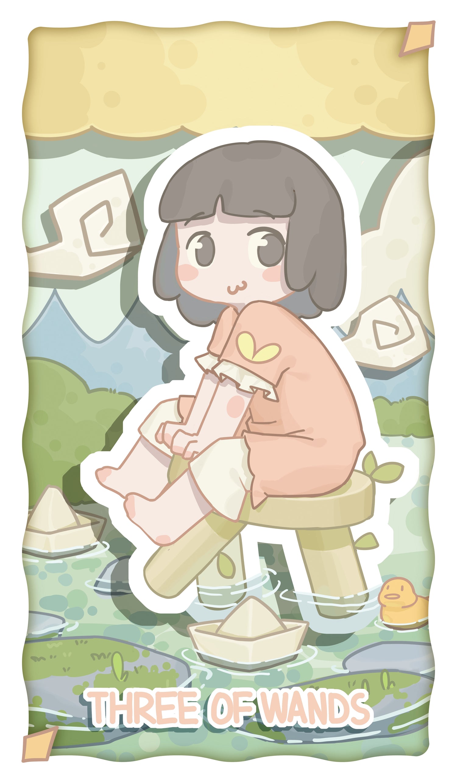 Card Information: “I wonder when these paper boats will return…” Sitting on a wooden stool by the river, the girl watches as paper boats and ducklings drift along with the current, while she remains in town to guard and provide support.