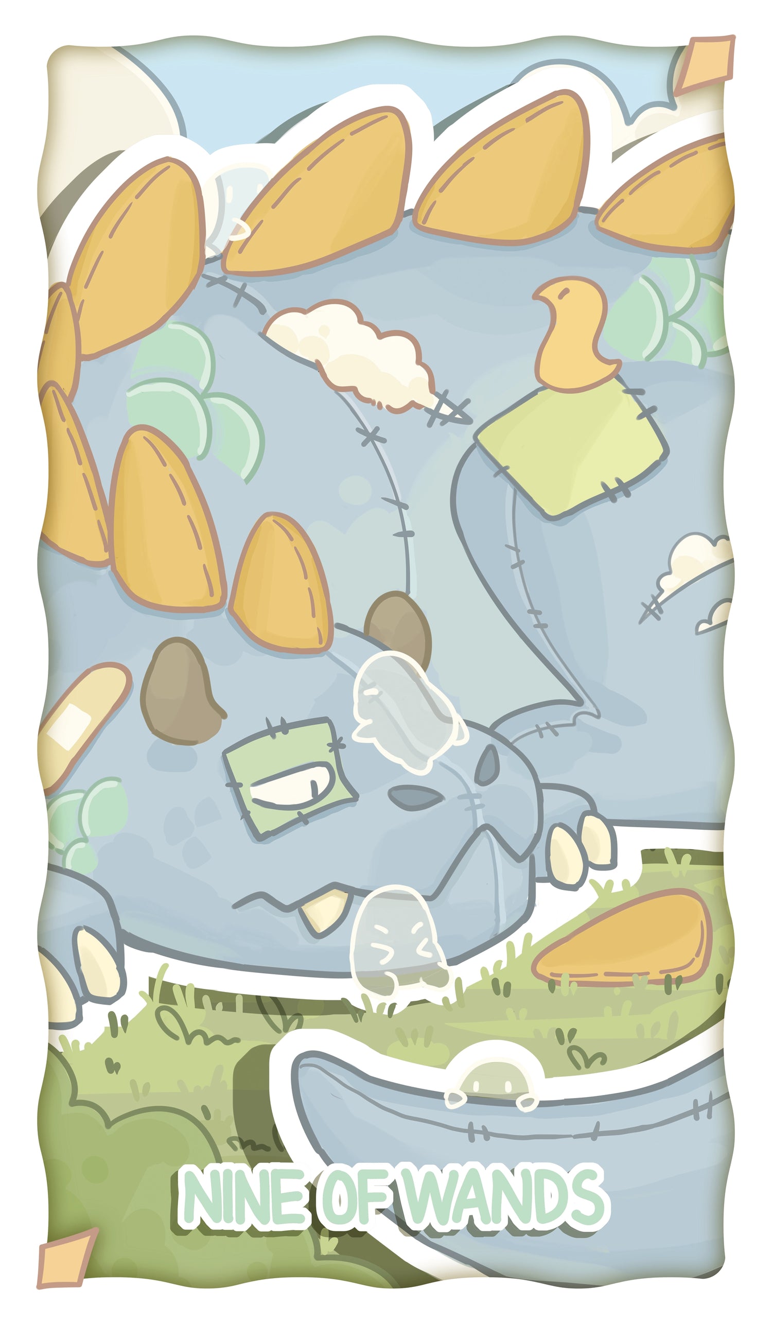 The dragon lies in the grass, its body covered in patches where tears have been sewn up. It looks as though it has been through a battle, yet remains unwilling to back down. Its curled-up posture suggests a defensive stance, ready and waiting. The small spirits on its back imply protection and support, while the neatly arranged horns symbolize order and preparedness. This is a moment of cautious watchfulness, aware of possible threats yet not yielding.