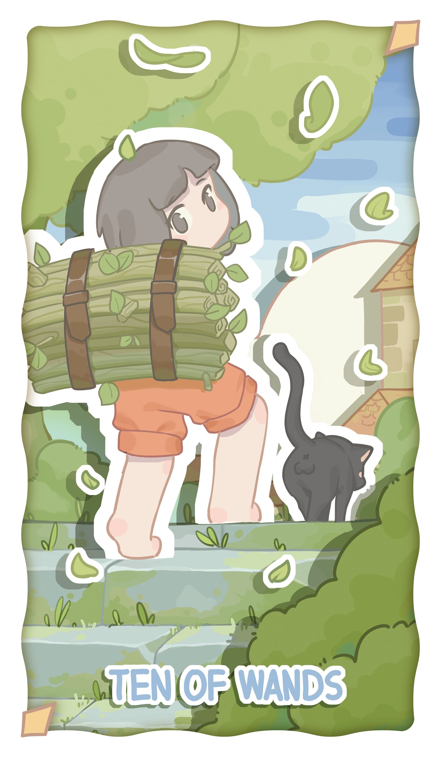 The girl walks forward with a bundle of firewood on her back, symbolizing fatigue and heavy responsibilities. The cat leading the way ahead suggests a reminder not to keep looking back—one must move forward. The town ahead represents the promise of rewards and success after the effort.