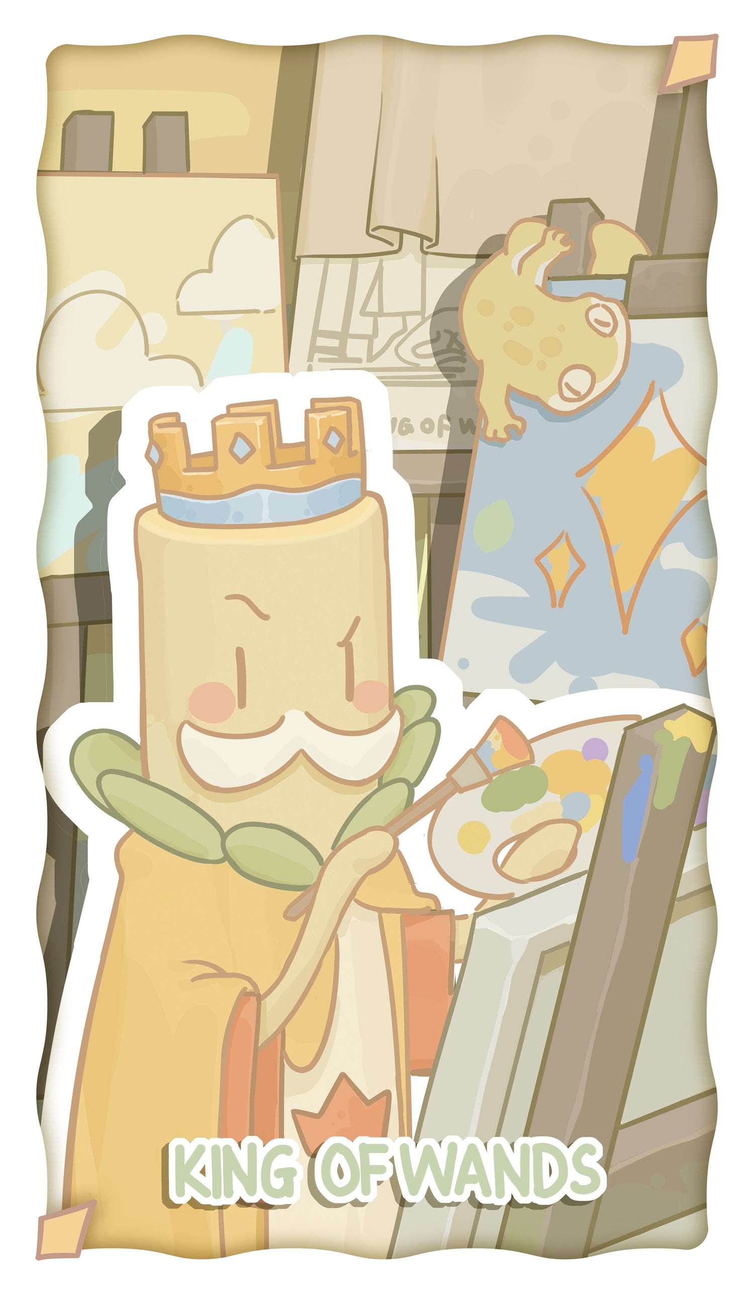 The king holds a paintbrush and palette, surrounded by canvases. His furrowed brow and focused expression suggest deep thought. The chameleon in the top right corner, sticking out its tongue toward him, represents patience and adaptability. The stable posture of the king reflects reliability, while the surrounding paintings symbolize everything he has achieved—his “throne.” The paintbrush in hand is his wand, and the act of painting represents turning visions into reality, driven by passion and decisive action.