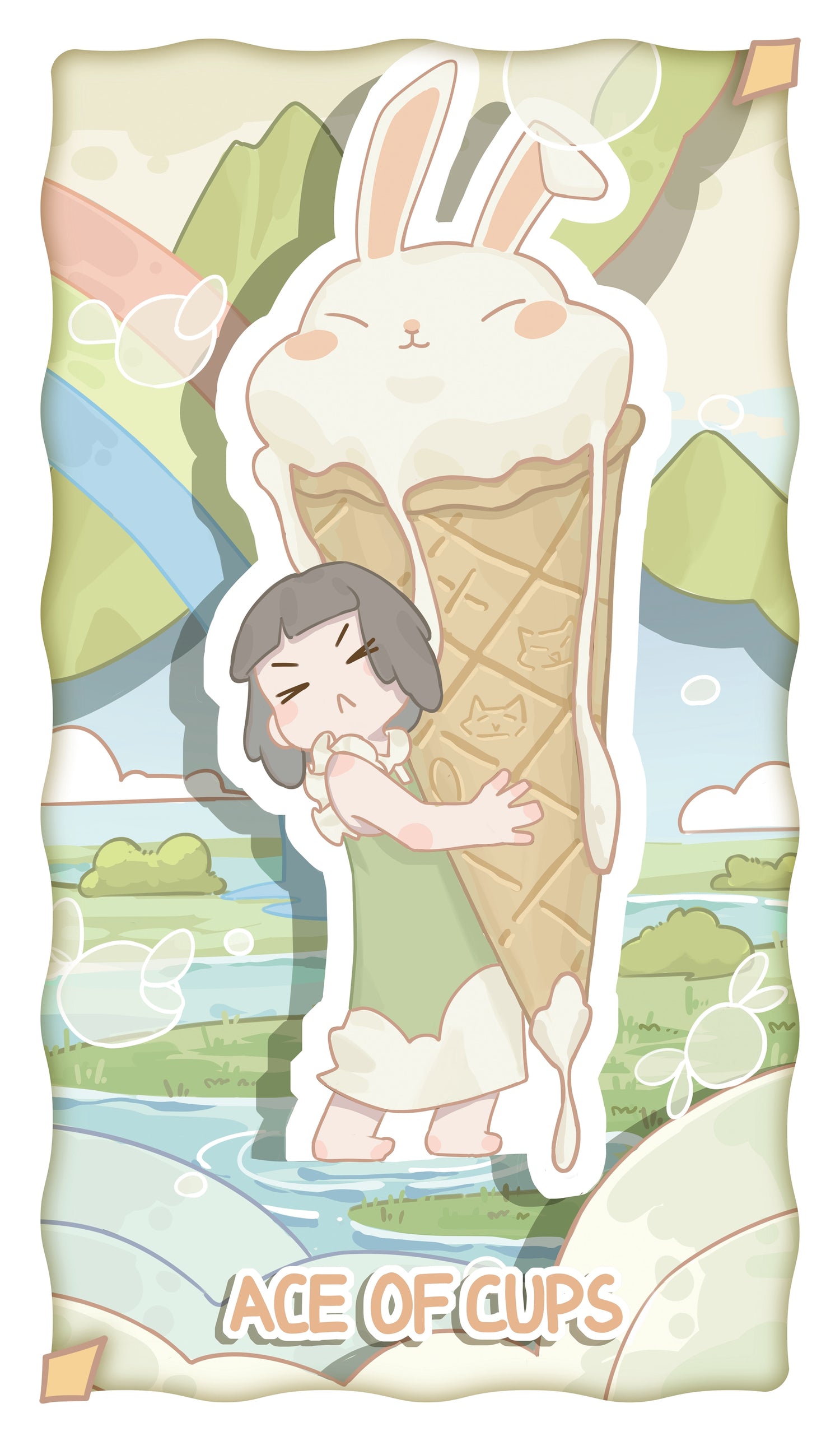 The girl hugs the enormous cone tightly. Though it’s heavy, she holds it firmly, representing another form of cherishing love—protecting what’s dear to the heart. The ice cream is a physical manifestation of emotional excitement. The rainbow above connects to the melting water below, symbolizing inner calm and emotional stability. The water droplets falling from the melting ice cream feed into the water below, indicating a pure and endless emotional source, where one continuously draws energy from the depths of the heart.