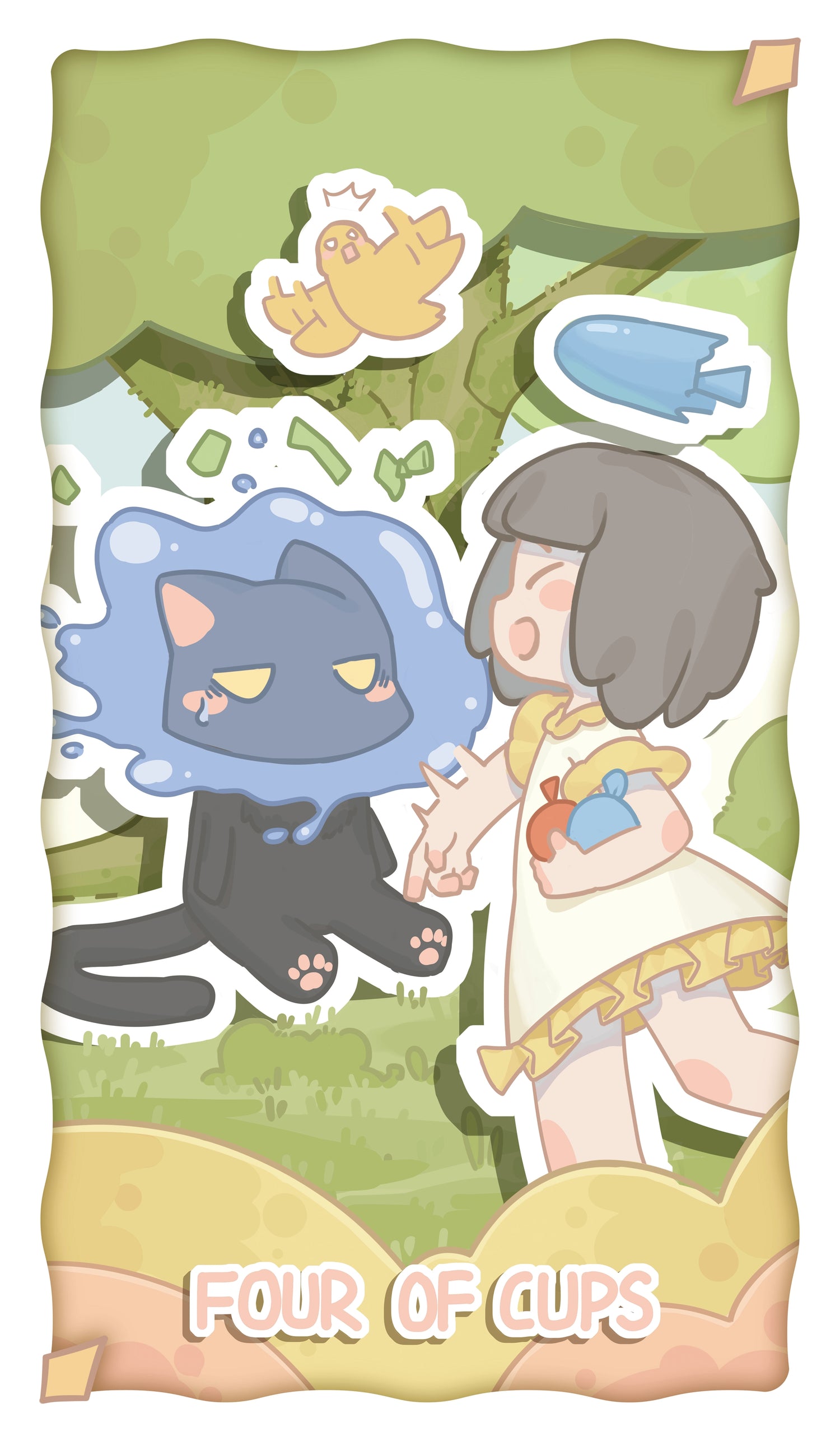 The girl holds three water balloons and chooses to throw one at the lounging cat leaning against a tree. The cat, caught off guard and motionless, gets hit squarely on the head with a splash, its expression full of discontent. The startled bird above flaps its wings and swoops toward the falling balloon remnants. The water balloon symbolizes sudden emotional events, while the girl’s playful yet daring action represents taking an opportunity to express herself or speak up. The three remaining water balloons in the scene symbolize past experiences and memories.