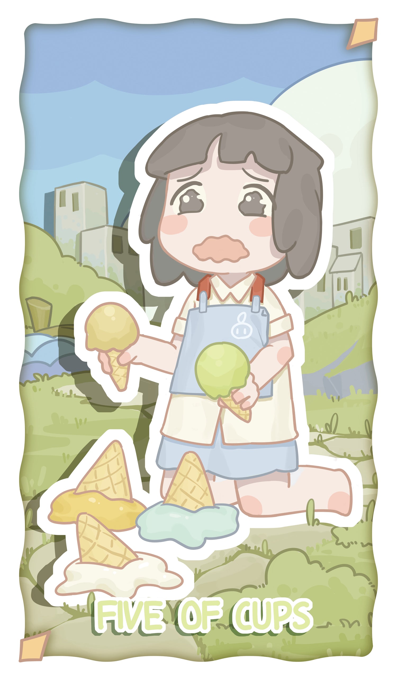 Card Information: “Moo moo moo! My ice creams!” Tears well up in the girl’s eyes as she stares at the three ice creams fallen on the ground, her heart heavy with sorrow. With a loud “thump,” she sits on the ground and cries.