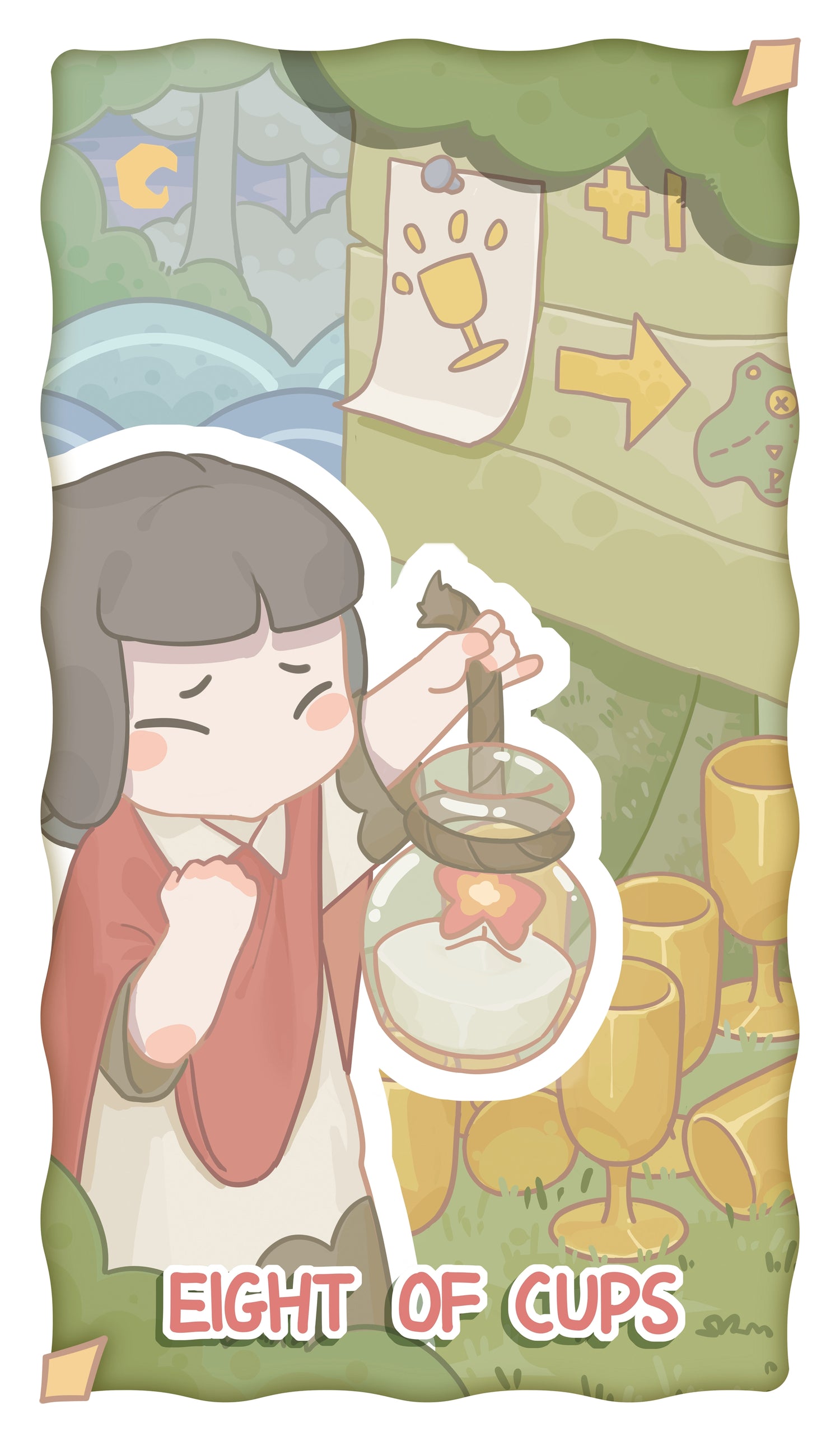 The girl ventures into the dark night, gripping her lamp with a mix of tension and determination. Everything ahead is unknown, representing action and movement. The lamp symbolizes guidance and direction. The tree behind her seems to guard the chalices, while the wooden sign points toward her destination, indicating her quest for the “Holy Grail of the Heart.” The eight cups arranged on the ground suggest that something has been left behind—what was once beautiful is now incomplete, symbolizing lack or emotional absence. The wall of tightly stacked cups conveys a sense of emotional barriers, with its gaps hinting at vulnerability and unspoken feelings.