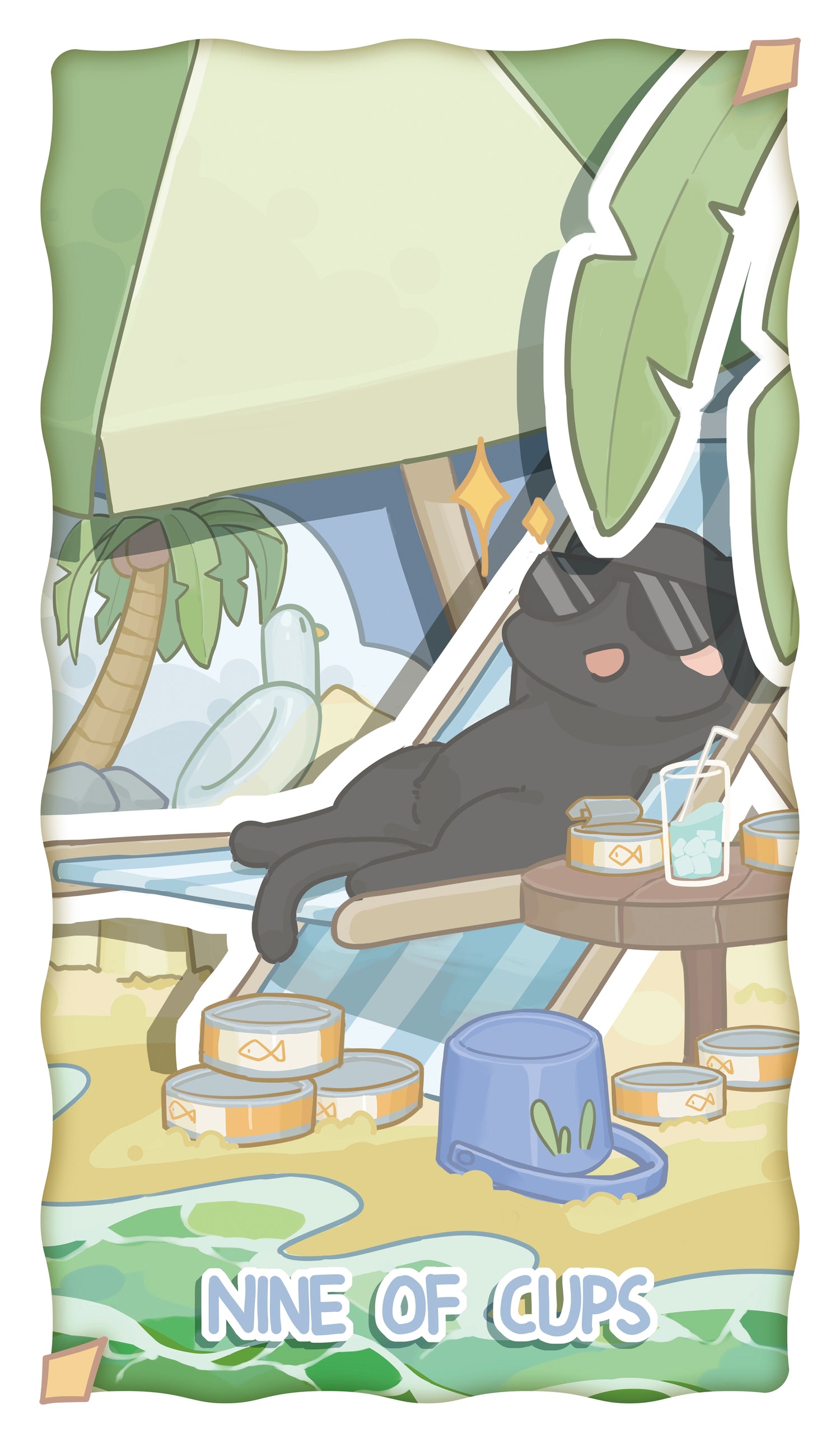 Card Information: “Mmm~ The fish cans are delicious~” The black cat lounges alone on a beach chair by the sea, surrounded by several cans of fish, some of which have already been licked clean.