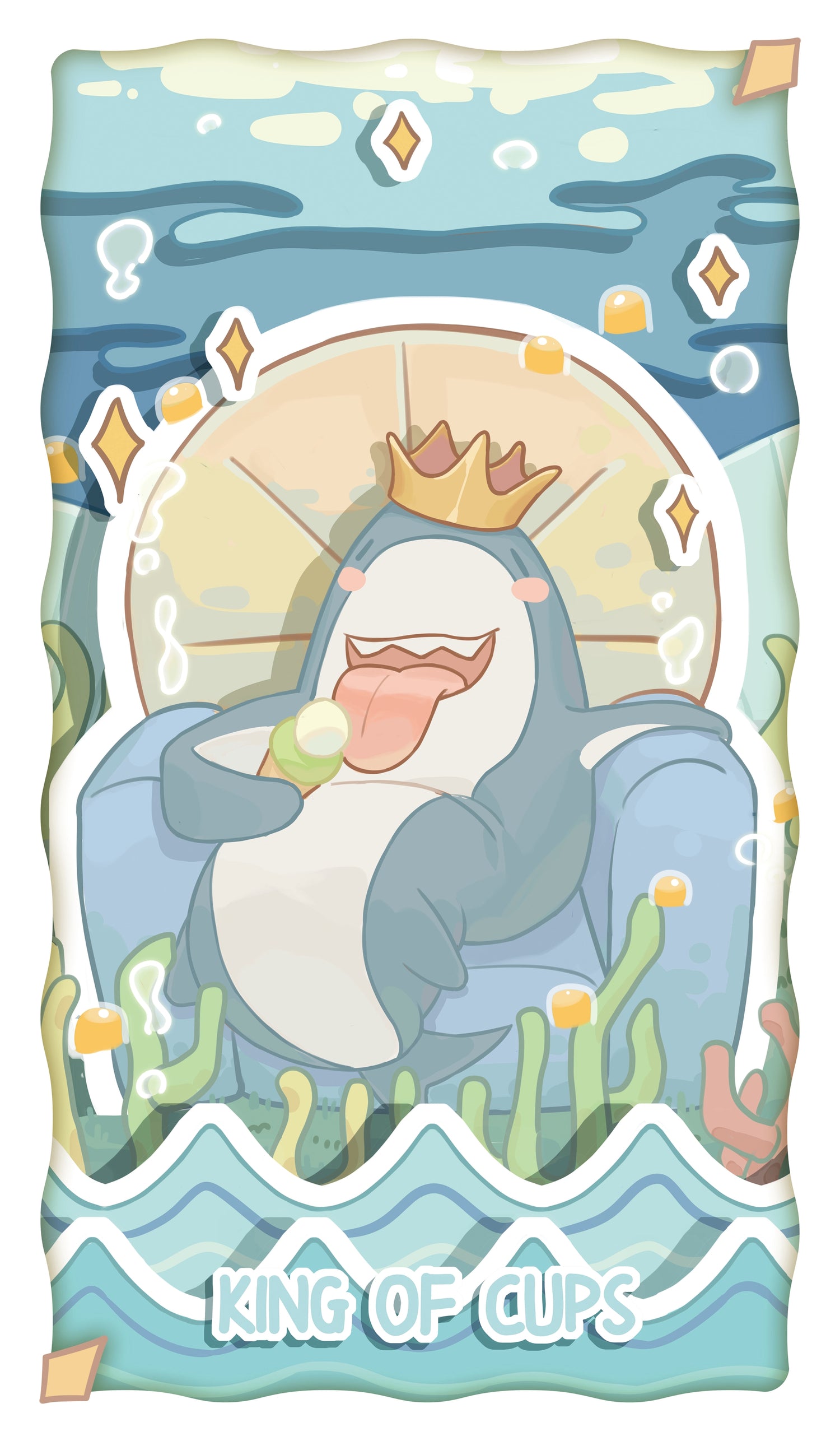 The Shark King holds a sweet in his hand, wearing a contented smile. His calm and peaceful demeanor reflects emotional stability. The surrounding coral sways gently in the currents, symbolizing satisfaction and harmony. The water flowing around him represents the ebb and flow of emotions, while the crown on his head stands for authority and responsibility. As the ruler of his realm, he remains unaffected by external turbulence. The shark imagery here also symbolizes mastery over emotions, showing that true control does not come from suppression, but from ease and confidence.