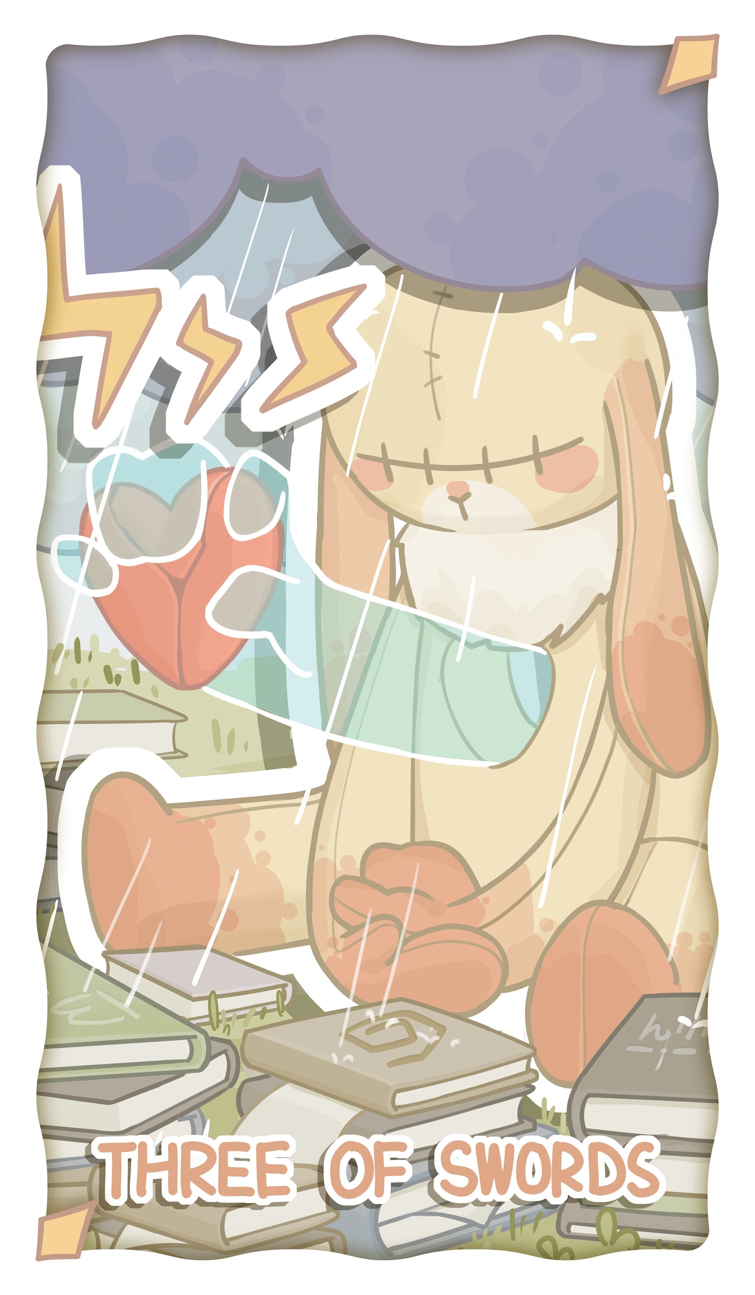A transparent rabbit’s hand pierces through the plush bunny’s chest, taking away its heart and separating them. The bunny lowers its head and sits quietly in sorrow. The storm and rain represent grief; the grey-green sky also reflects lingering pain that’s hard to escape. The three bolts of lightning symbolize wounds that strike directly at the heart. Though the storm will eventually pass, for now the heavy feelings remain. Surrounded by stacks of books, the scene suggests being trapped by circumstances, unable to break free.