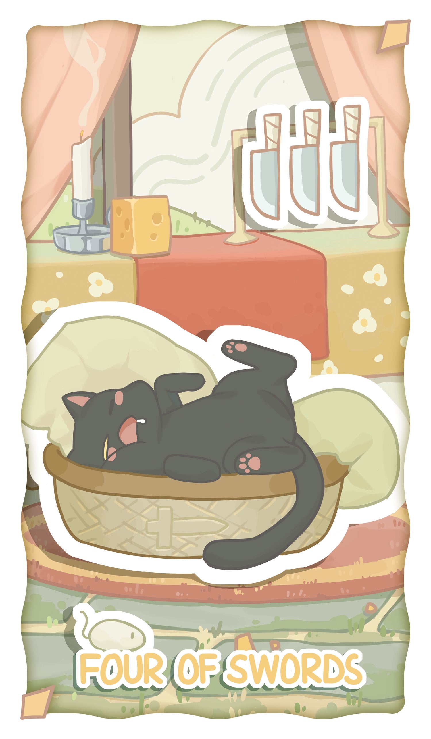 The black cat sleeps deeply in its bed, its relaxed posture showing fatigue and a need for rest. The flickering candle beside the table releases curling smoke, while the gentle sway of the curtains under sunlight adds to the calm scene. This card conveys a sense of peace and stillness, representing the cat’s inner world. The mouse toy on the ground and the cheese machine in the distance suggest unfinished tasks—symbolizing external pressures. The three swords standing nearby hint at potential danger, but there is hope that once the cat wakes, it will be ready to face and resolve them.