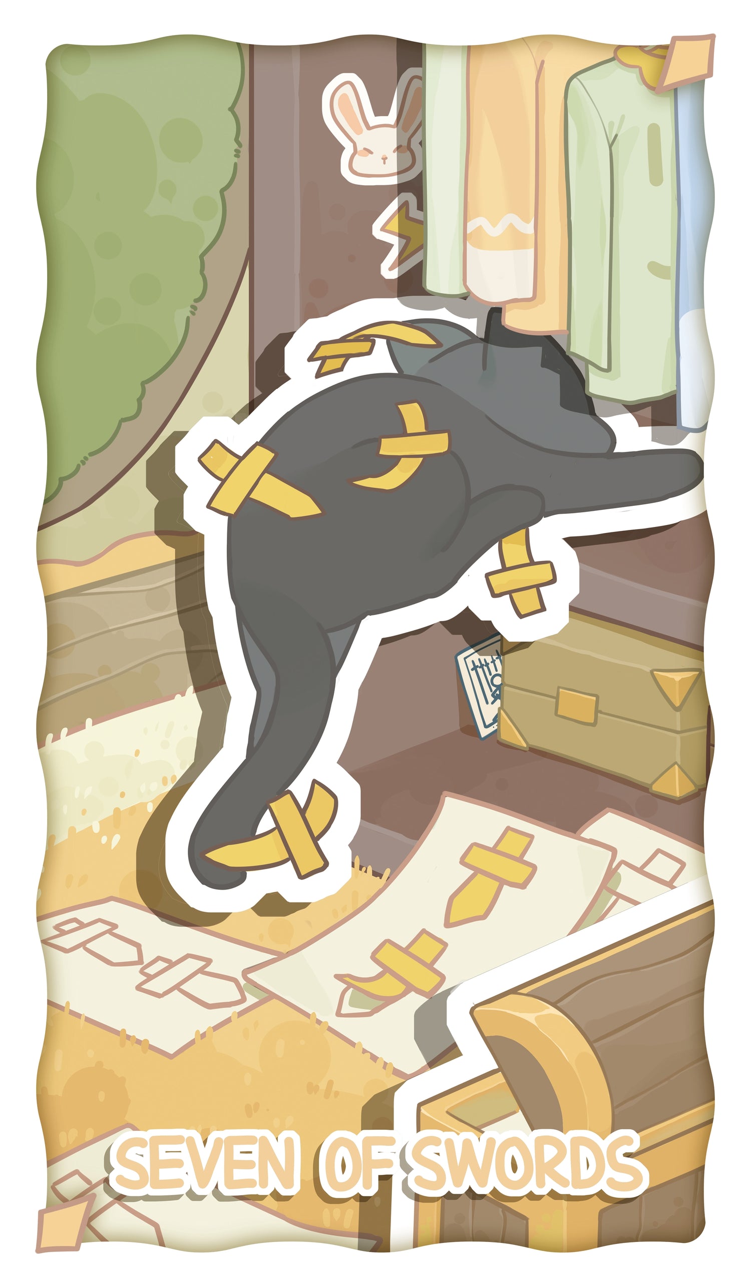 Card Information: “Hide quickly, or you’ll be caught by the cat police, meow!” The little black cat sneaks into a neatly arranged wardrobe, but a large piece of tape stuck to its fur on the floor gives it away.