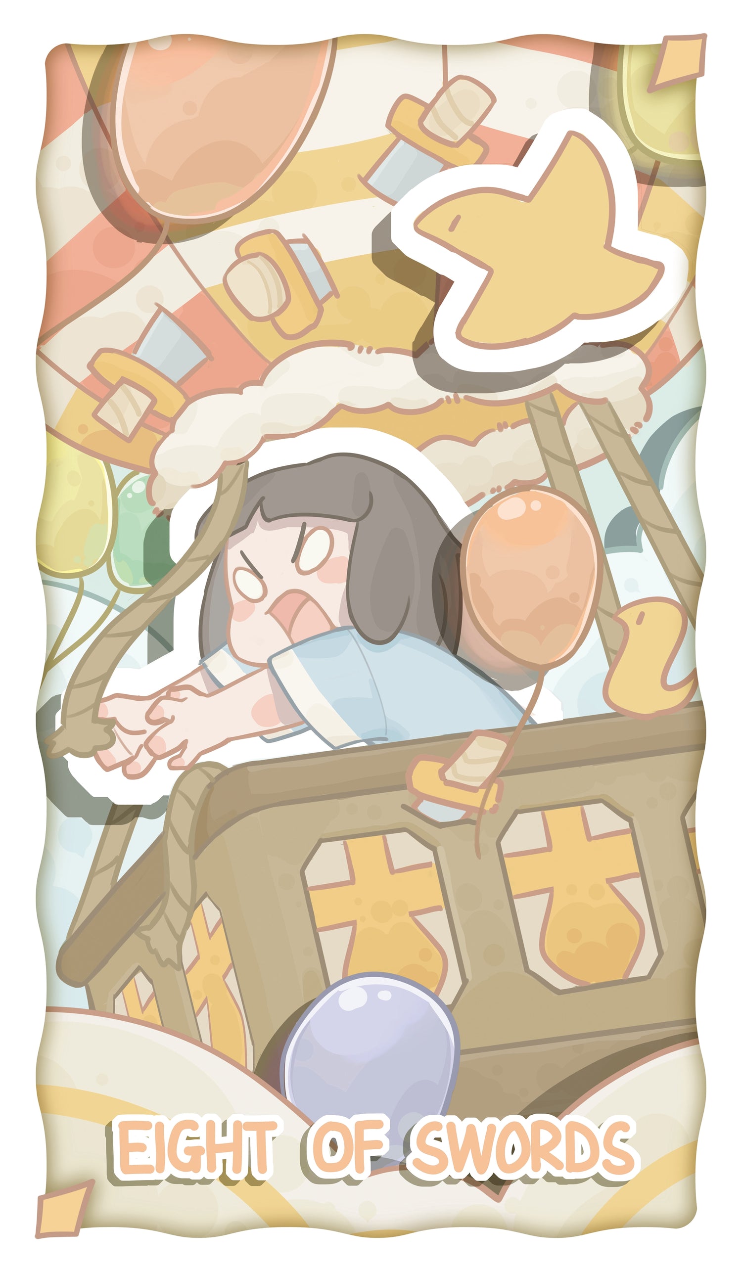 The girl on the hot air balloon reaches to grab a fraying rope, but it looks dangerous. The swords embedded in the balloon suggest looming trouble. It seems like the basket could fall at any moment. She has reached the extreme limit of her height, unable to break through further. The next step is figuring out how to land safely.