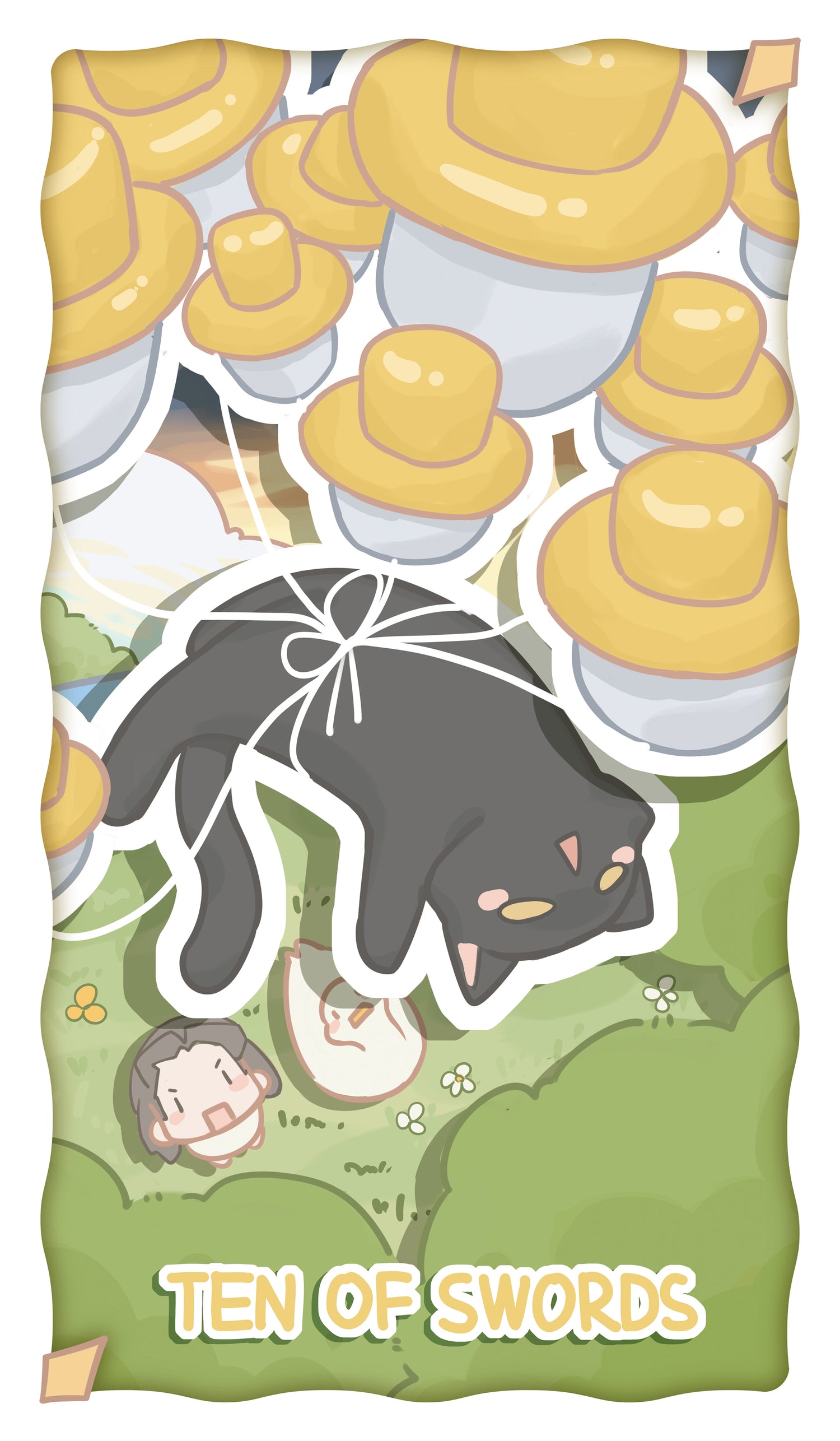 The cat is lifted into the air by the sword-shaped balloons. It appears to have lost consciousness, representing despair and immense pain. The girl and the duck quietly watch, their faces filled with shock and sorrow, as they see the cat gradually drifting farther away. For the cat, whether its companions will eventually rescue it remains uncertain, symbolizing a turning point.