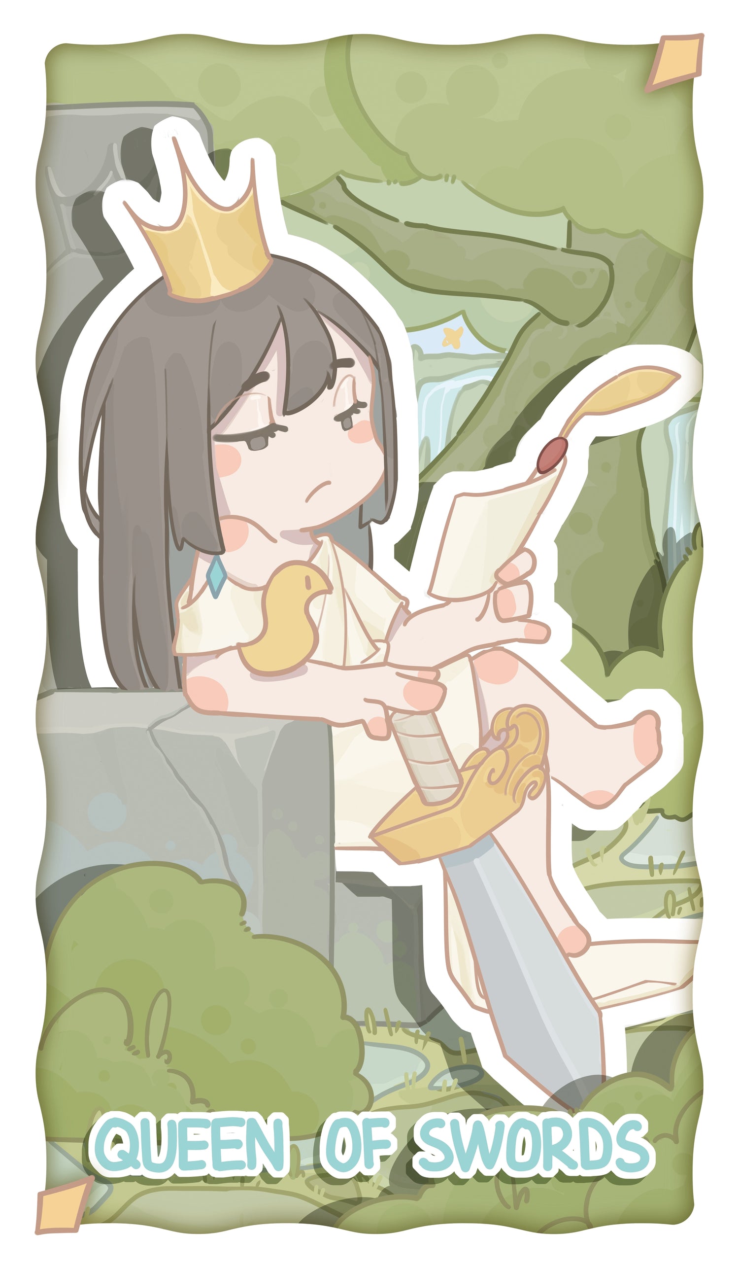 The queen holds a letter in her left hand, reading it intently with seriousness and focus. Her right hand casually rests the sword’s tip on the ground. Her posture conveys a sense of composure and ease, as if her thoughts are free from restriction. The bird rests quietly at her feet, and the queen has not driven it away, suggesting her acceptance of the messenger. In tarot imagery, the Queen of Swords symbolizes rational judgment and wisdom.