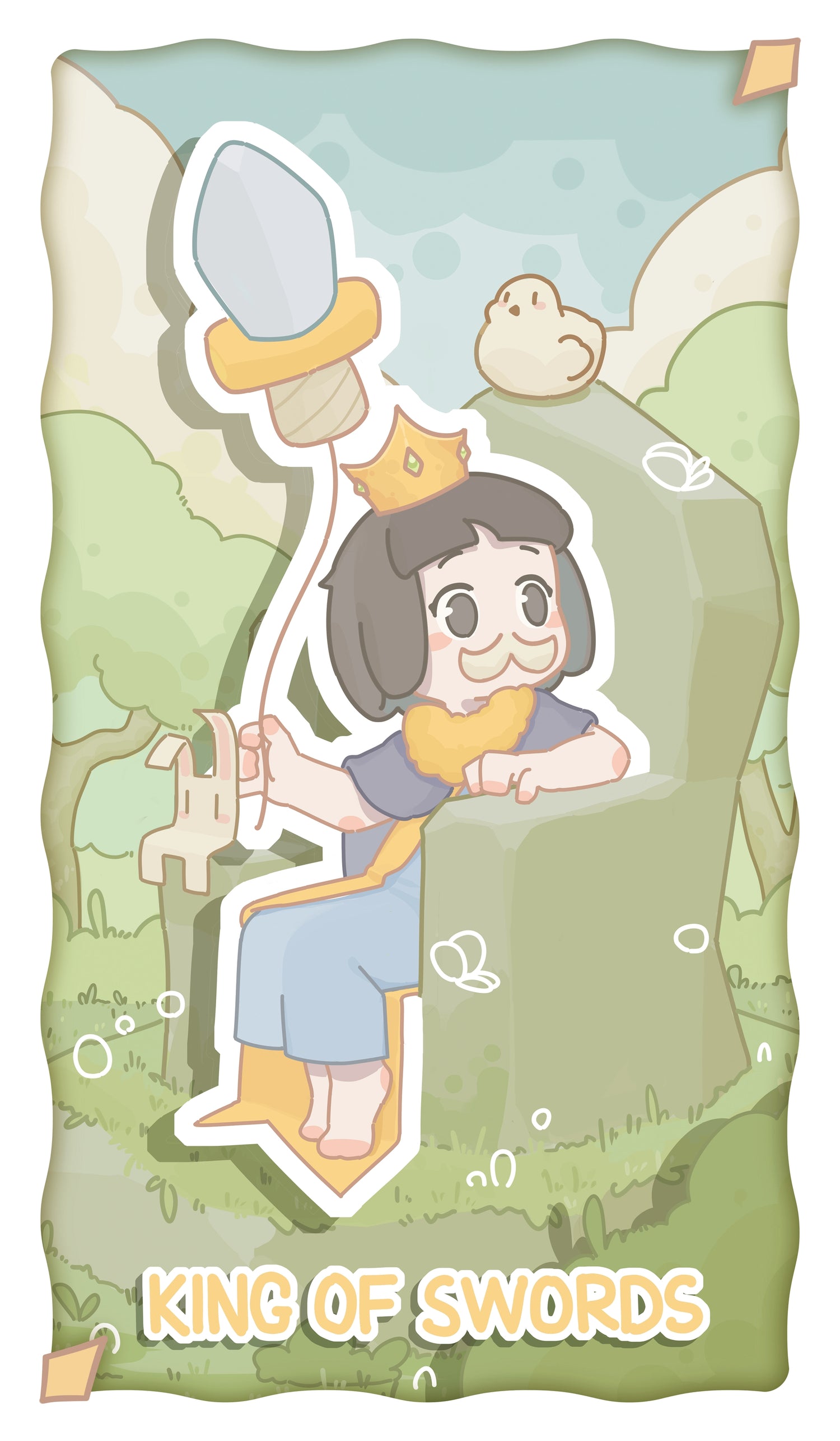 The king holds the sword while seated on the stone throne, the sword tip tilted slightly to the right. A radiant halo encircles the crown on her head. The green gemstone represents authority. A butterfly fairy atop the stone flutters her wings, symbolizing the blend of agility and spirituality. The white bird perched on her arm represents the harmony of wisdom and freedom. Slightly tilting her head, the king appears deep in thought, either contemplating something or attentively observing a matter.