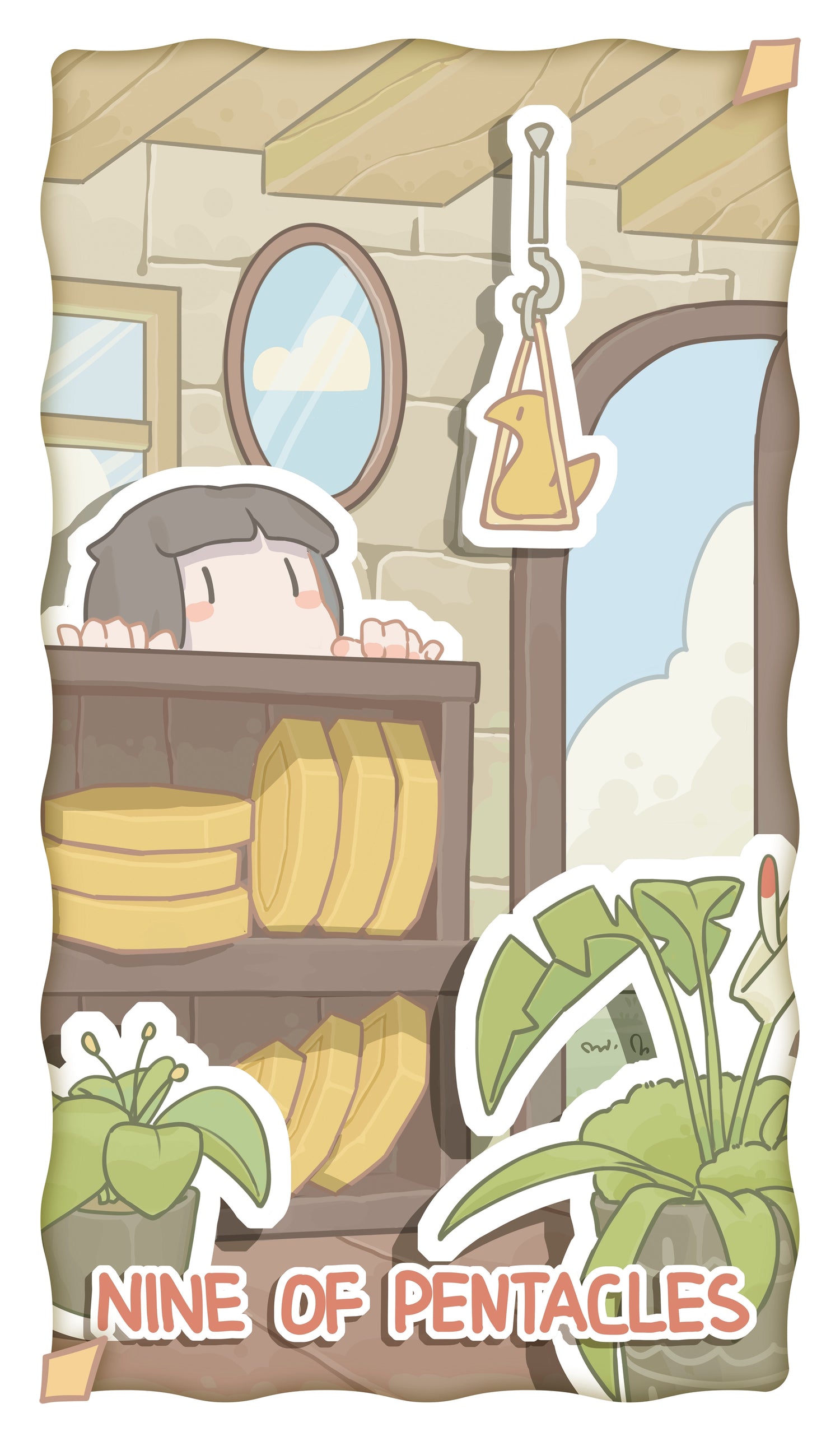 The girl leans on the cabinet, gazing at the bird hanging from the ceiling — a sign that freedom is limited, and the bird is in a nurtured state. The gold coins beneath her represent her private wealth, while the green plants in front of her symbolize abundant property and possessions. This scene reflects wealth, success, and comfort. The door behind her opening to the outside world suggests a peaceful, secure life being enjoyed.