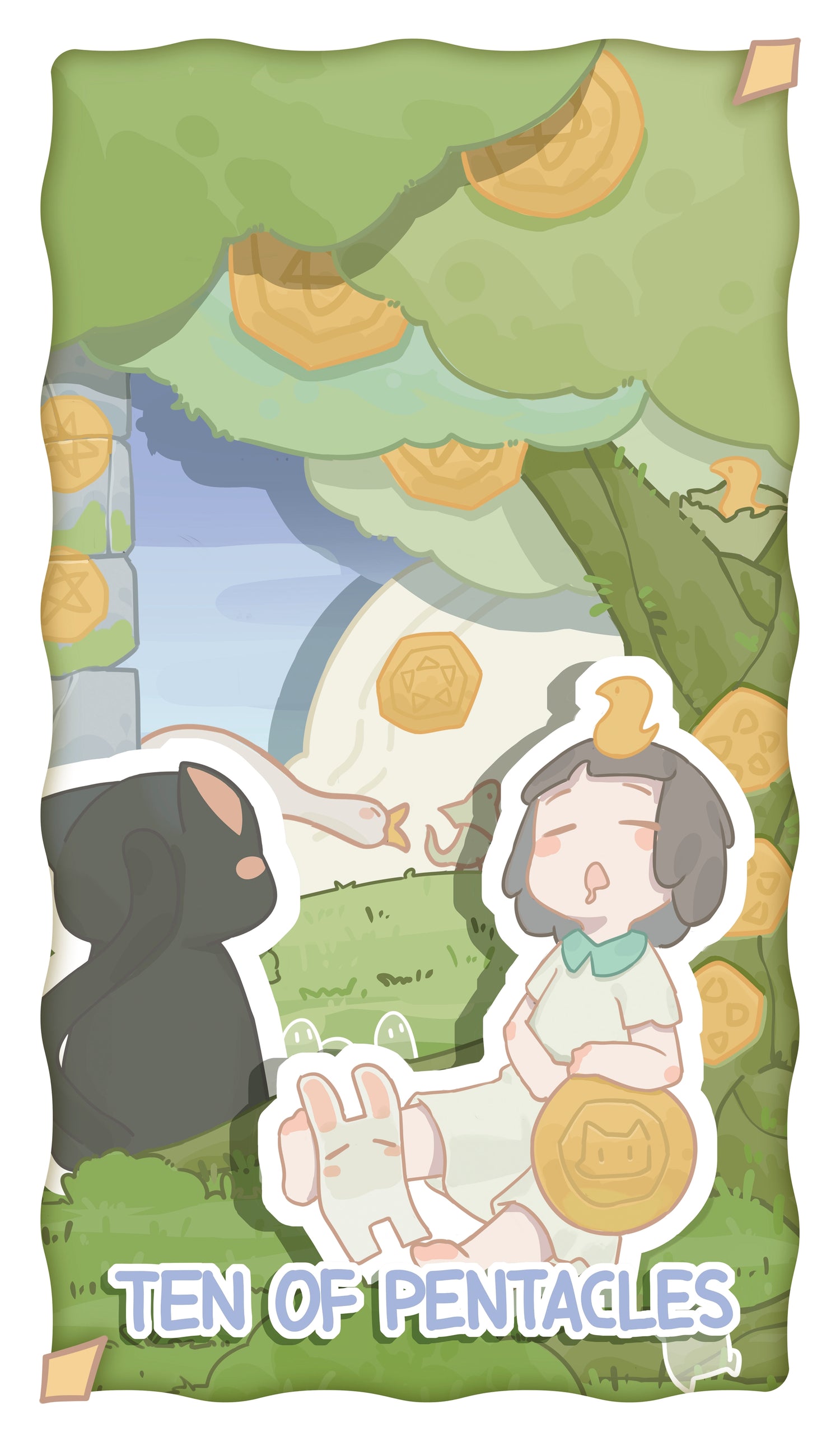 The girl and her companions appear together in the frame, symbolizing unity. She leans against a large tree with coins embedded in it, representing wealth, stability, and groundedness. The duck looks into the distance, while the cat gazes at them with attentive curiosity. Everything appears warm and harmonious — the tree on the right and the frame of the scene both signify stability. However, the sleeping girl also suggests a possible emotional detachment from family matters, hinting that there may be a lack of sufficient emotional exchange within the home.