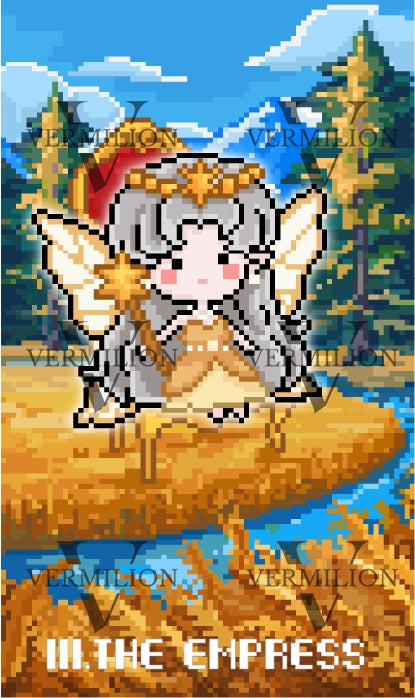 The elven queen, Eluna, sits relaxed on her land. Ears of wheat surround her, sprouting and growing, then bending under the weight of the abundant grains. Eluna gently waves her queen’s scepter, and the rhythmic pulse of life turns into a river that joyfully flows into the lively forest.