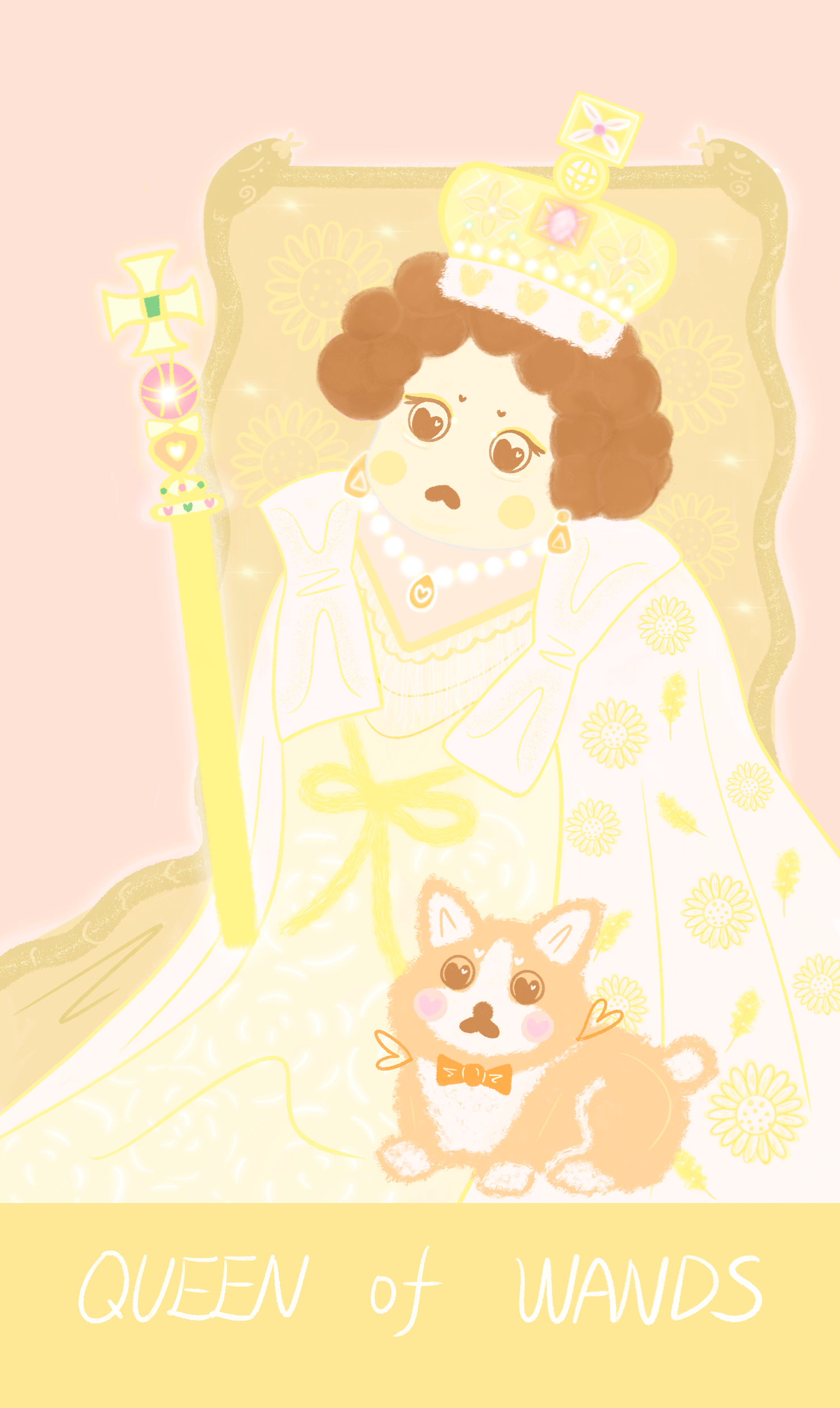 She dons a sunflower-patterned cloak and sits on a sunflower-adorned throne—sunflowers symbolize joy, light, and her dominion over nature. In place of the traditional black cat, her beloved corgi rests in her lap, symbolizing inspiration and intuition. A serpent carved into the throne alludes to her mastery over primal instincts. The Queen of Wands represents success achieved through inner strength—a union of fire and water.