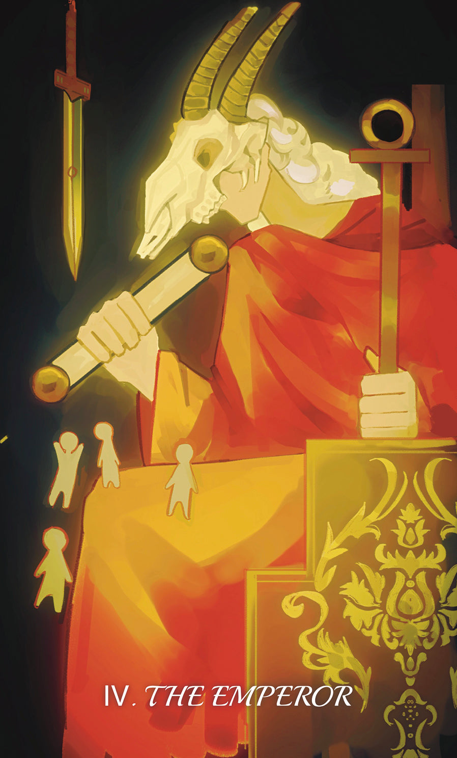 He sits high upon his throne, wearing a goat skull crown symbolizing authority and power. In his left hand he grips a bronze scepter of rulership; in his right, a scroll of engraved law. Leaning forward, a cold and gleaming Sword of Damocles hangs before him, forcing him into a perpetual stance of vigilance and solemn rule. The entire hall is steeped in an austere atmosphere where power and danger coexist.