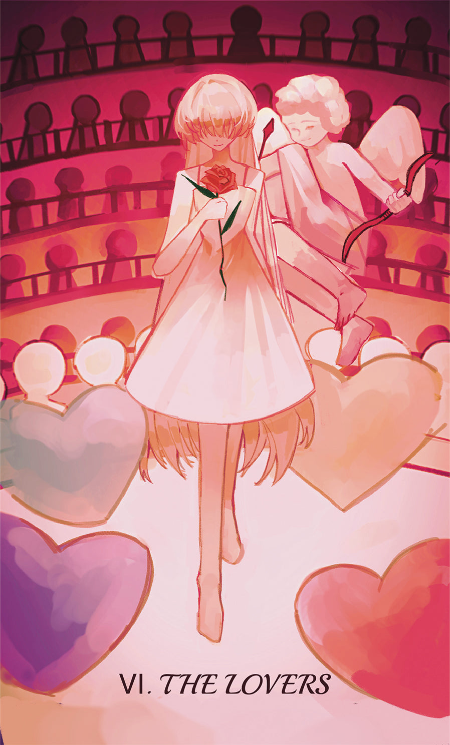 A girl stands at the center of a stage, holding a rose. A spotlight shines from above, obscuring her face in shadow. She is not the carefree maiden; how should she make a decent and correct choice on stage? Should she turn left, or right? Where is the way home? Cupid silently descends beside her, wings fluttering, waiting for this wandering soul to make her earnest decision.