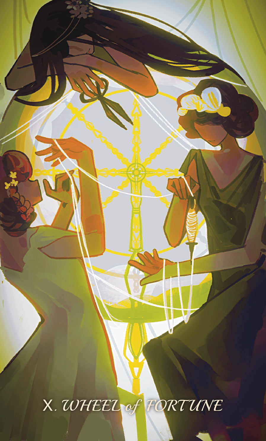 The three Fates circle around a golden spinning wheel, each holding the threads of life: