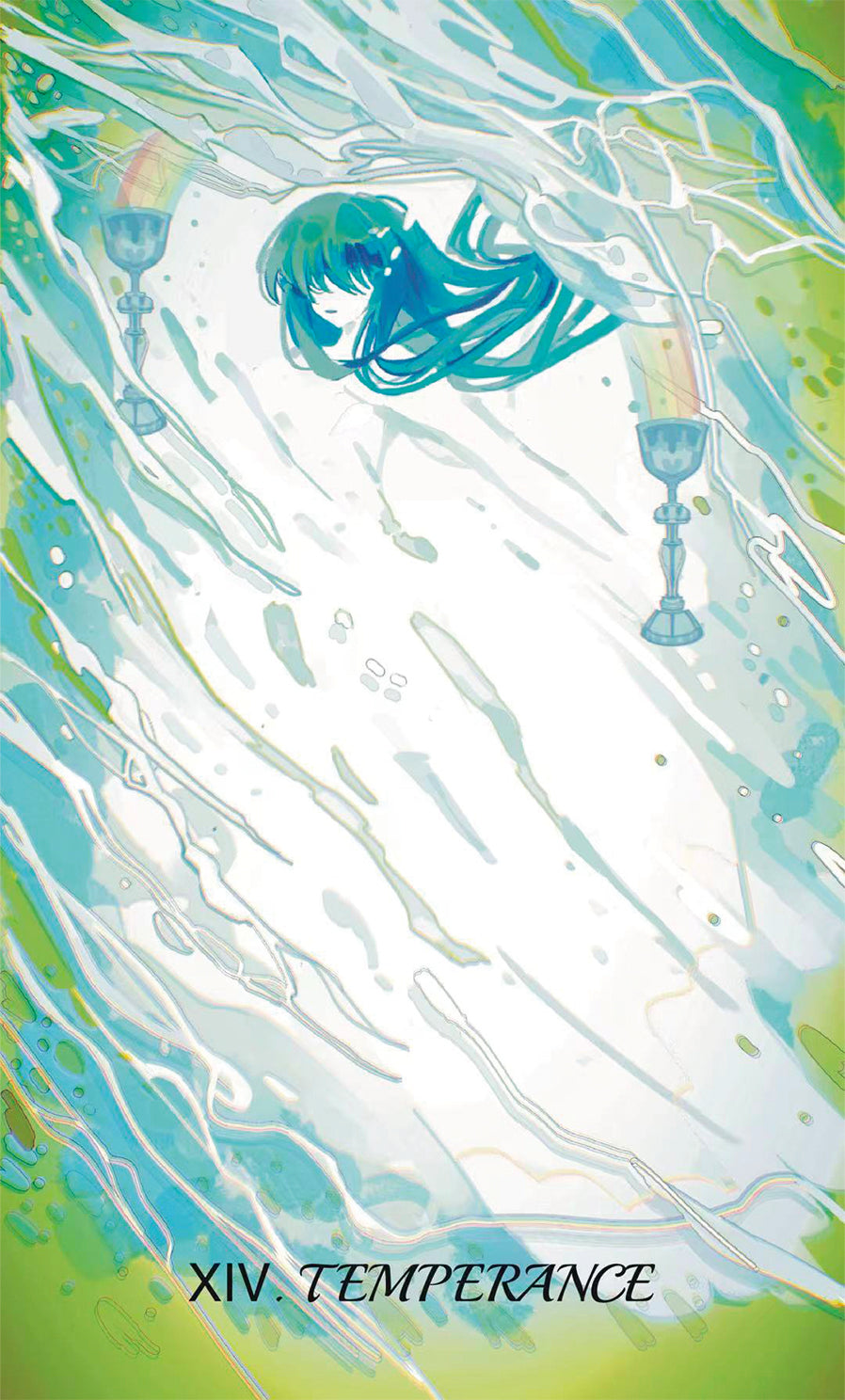 The girl holds two cups, almost merging with the flowing water. A rainbow arches above her, connecting the two holy grails. She is Iris, the goddess of the rainbow, gently tilting her vessels, balancing the waters within. She transforms the human’s wishes, joys, sorrows, and anger into vapor that rises. Then she turns the blessings of the gods into dew, pouring them back into the world.