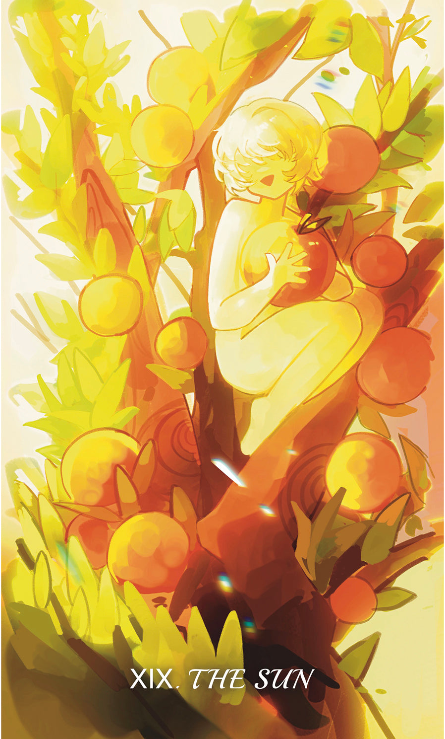 The golden, glowing sun is so bright and full, and everything flourishes under its gaze. It is the season of harvest — the fruits hang heavy, their yellow hue like solidified sunlight. Children climb the branches, holding golden fruit, as if they, too, were born of the sun’s light. Light and warmth are generously given, and all living beings bathe in this bright blessing.