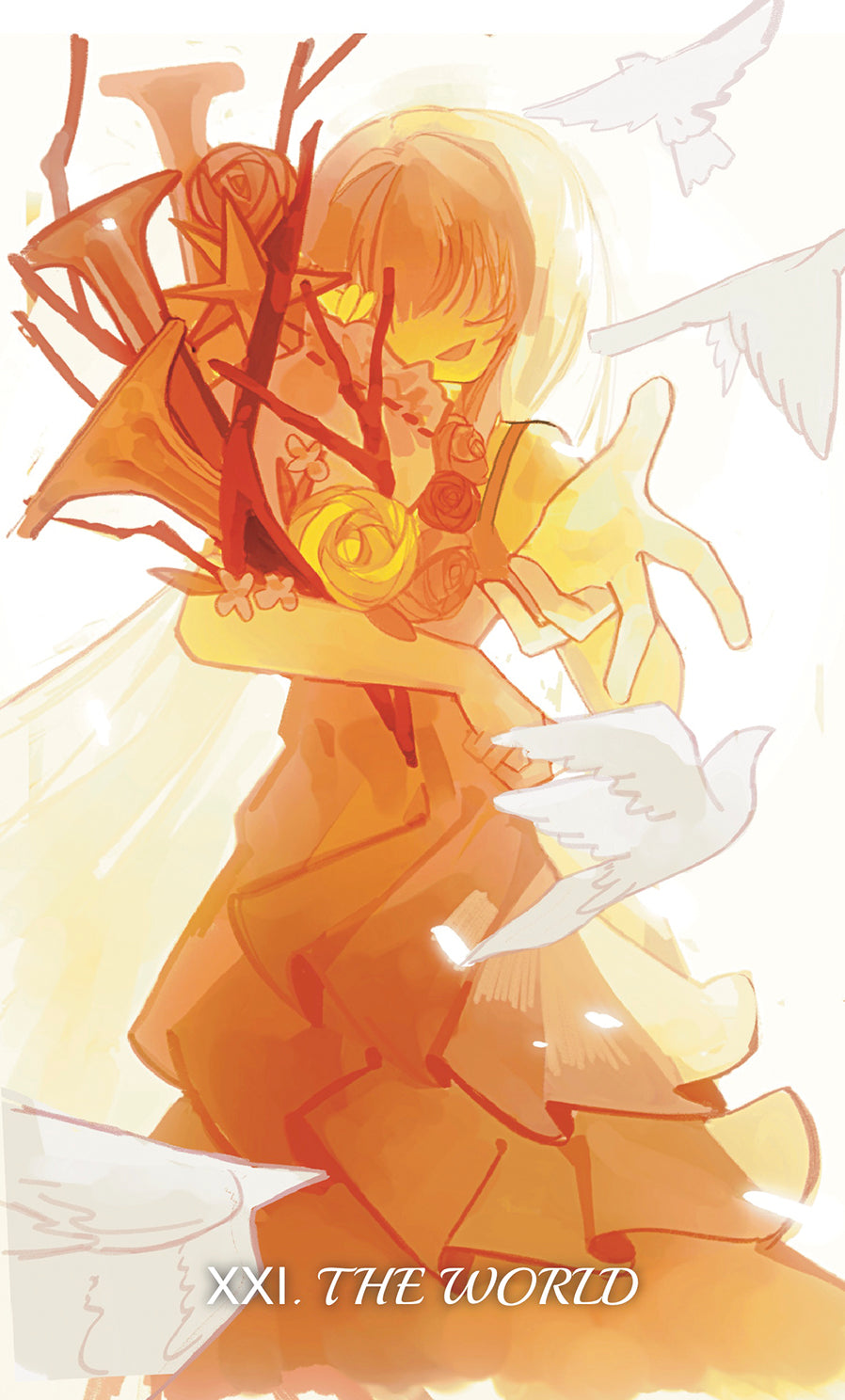 The girl cradles the branches, stars, mail, flowers, and trumpet she has collected along the way. When the long journey reaches its end, she extends her hand to invite you to join her in the final chapter of the story. The flying bird that began the journey as The Fool has now finally taken shape within the confines of a finite life. At this moment, you have become the master of fate, walking confidently toward the perfect closing of the cycle. Perhaps on the other side of the pure white light, a brand new world is being born.