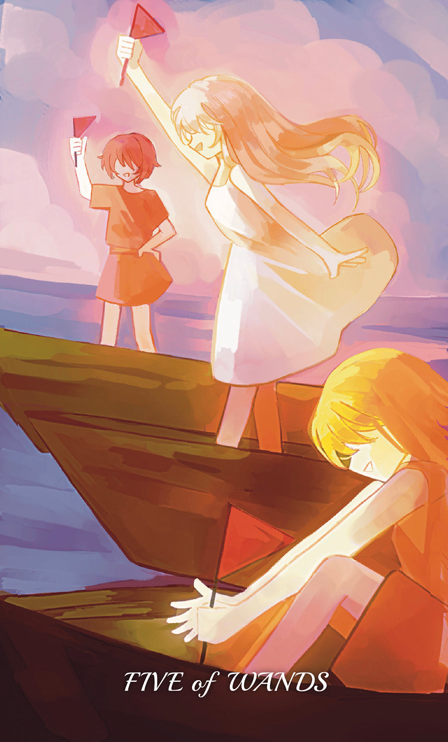 A softer conflict after the stage victory of the Four of Wands. The nature of Wands urges people to compete again. This competition is usually fair, and people view it as a way of communication and progress. When reversed, this competition may become more serious and less friendly.