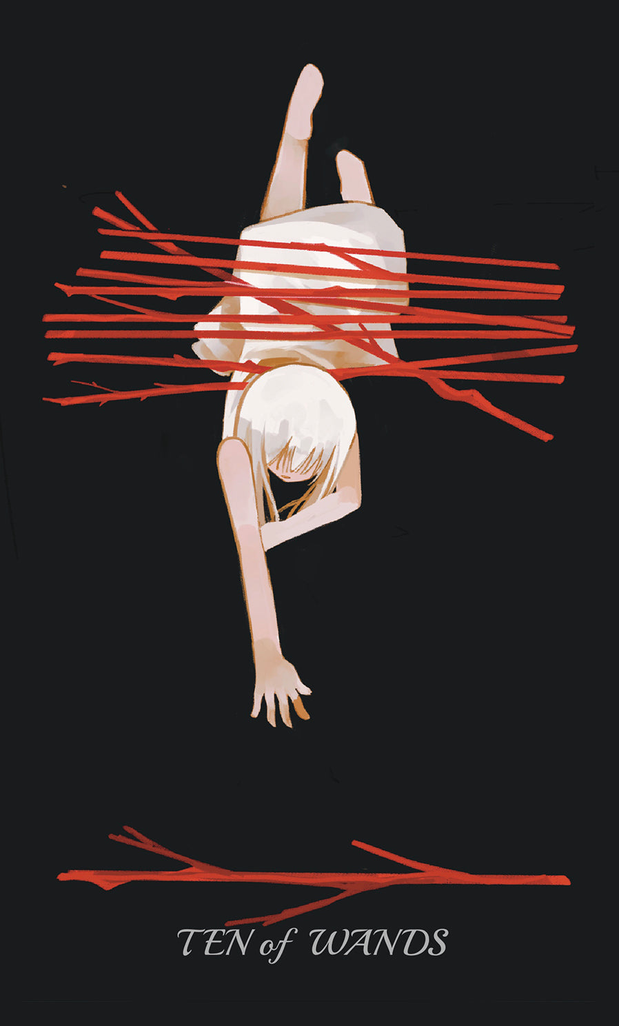 The tired, weary girl, burdened by nine wands, stumbles forward in search of the tenth. She is an unquenchable flame, and the things she pursues seem to have become obsessions she cannot release. These burdens, while they have brought her this far, are now overwhelming her body.