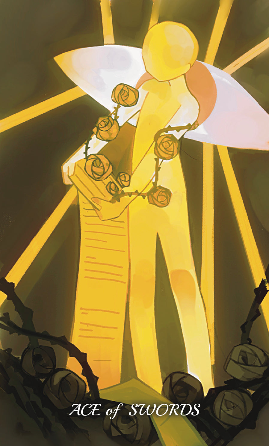 She opens the scroll, and the yellow rose, symbolizing wisdom, blooms around her. She opens her eyes and looks at the world for the first time with clarity. The rose winds around her, its thorns pricking her, but it doesn’t matter. The rose is so bright and radiant.