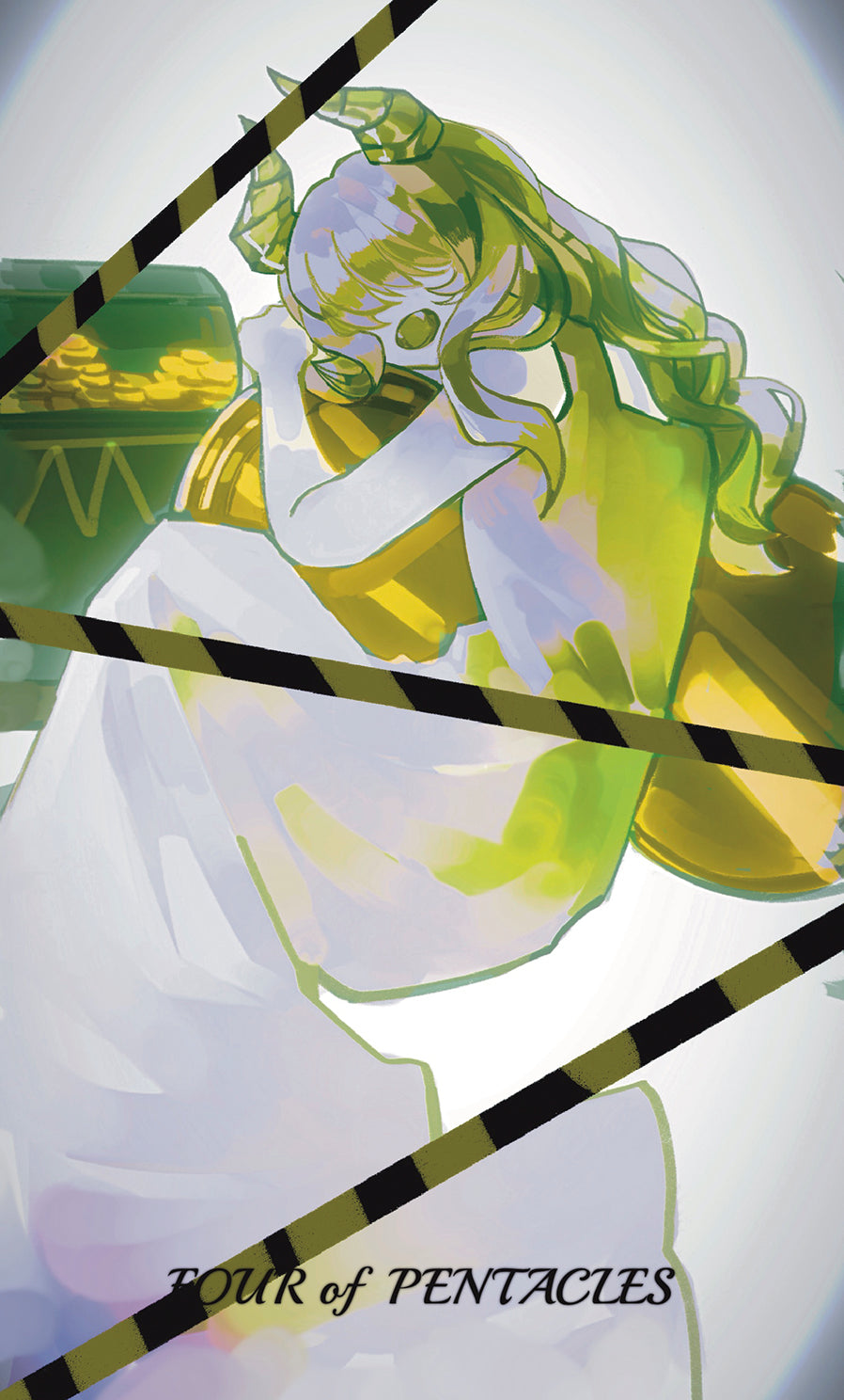 This card describes the accumulation of wealth. The Four of Pentacles suggests an excessive focus on stability and rigidity, turning the accumulation of wealth into an obsession. A lack of security may lead to the desire to trap wealth, inadvertently confining oneself.