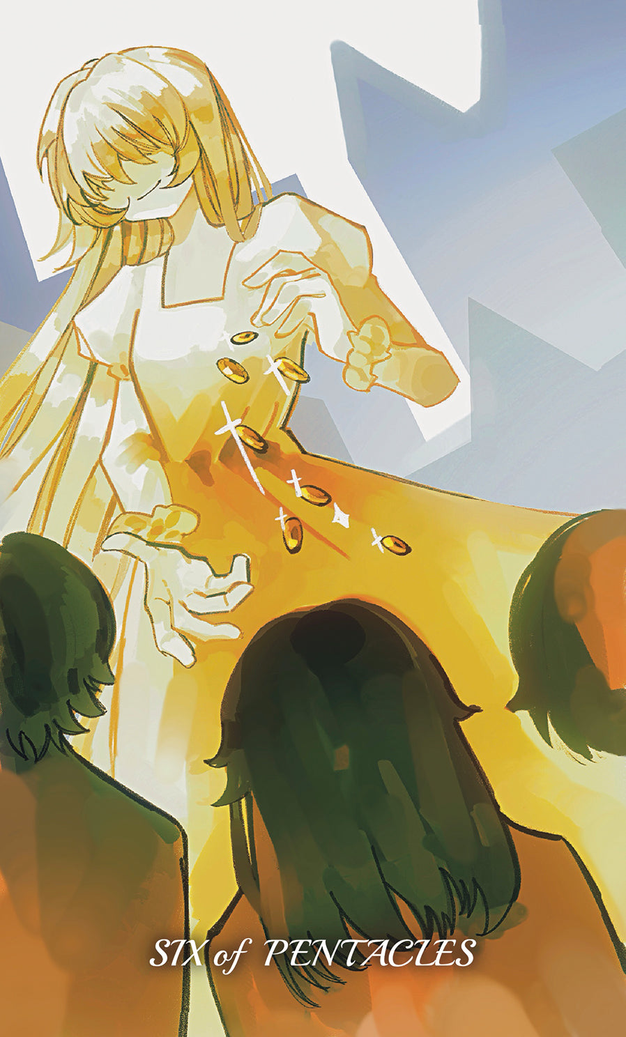 A generous woman, wearing fine clothing, gently smiles as she looks down at those she is giving coins to. She scatters a few gold coins, but this act may not be pure kindness — it is mixed with a sense of superiority and evaluation of the recipients’ lower status.
