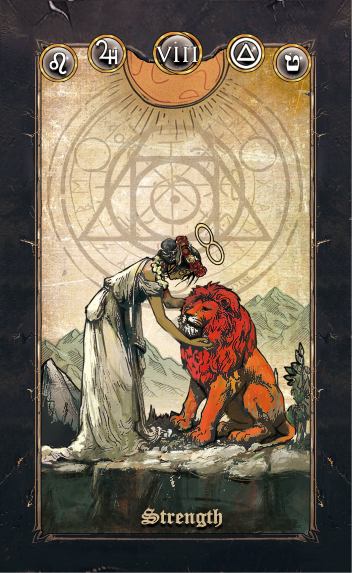 Card Elements: Infinity symbol, lion, roaring lion, mountain, white long dress, woman calming the lion, trees