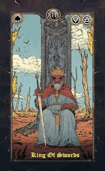 The King of Swords sits on his throne, facing forward, as if ready at any moment to face whatever life throws at him. He holds a sword in his right hand, with consciousness and rational thought in his grasp. This symbolizes the king’s decisiveness and also his flexibility in all matters; although his decisions are mainly based on his own wisdom, he remains open to opinions. The king wears a blue robe, symbolizing a longing for spiritual knowledge, and a purple cloak, symbolizing his compassion and wisdom. Behind his throne are decorations with a butterfly (transformation), a crescent moon, and an angel near his left ear, as if giving him subtle guidance.