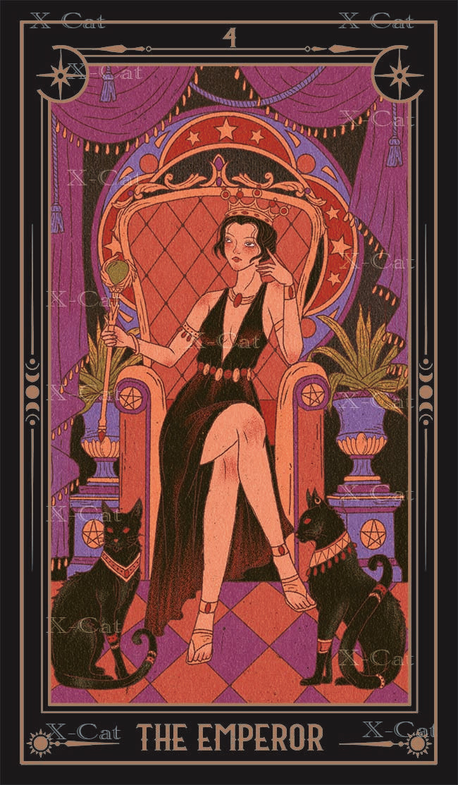 The Emperor reclines casually on her throne, her gaze sharp and calculating. She firmly grasps her scepter, radiating power, ready to issue commands across her domain. Two black cats sit before her, vigilant and respectful, always prepared to execute her orders.