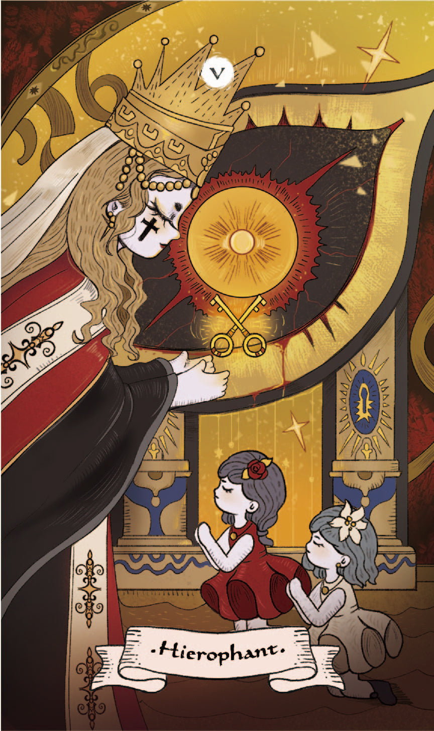 Soothing the soul with spirit, veiling darkness with light — all that is unknown or unattainable becomes clear to the eye of the heart, parting the clouds to reveal truth. Within a grand and solemn cathedral, she wears the triple crown symbolizing supreme authority and a deep crimson robe of faith. With serene compassion, she enlightens her followers, eyes gently closed as she grasps the Keys of the Sun and Moon, unlocking the spiritual eye that perceives all. At this moment, she is connected to the hearts of every believer, comforting their souls with her own, dispelling darkness with radiance, and guiding them from confusion through her boundless wisdom and mercy. She is the spiritual authority, the mentor of the soul, the embodiment of faith — the light that leads to truth.