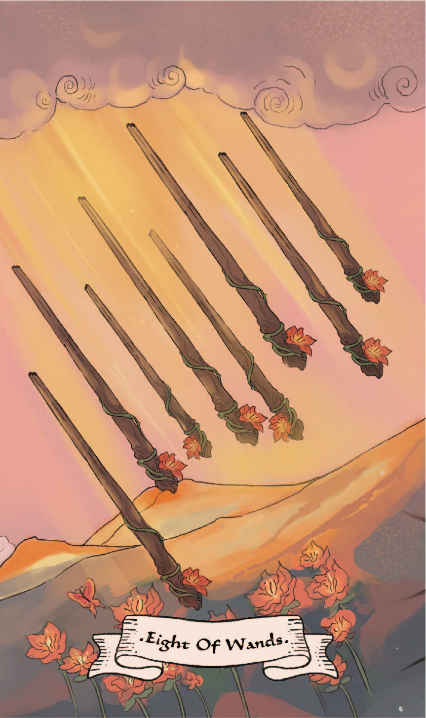 “Speed” is the central theme of the Eight of Wands. Eight wands soar through the air like aircraft, symbolizing rapid movement and events developing faster than expected. Matters long delayed are now reaching resolution within a short period. If you have previously set goals, this card suggests you may achieve them quickly. The Eight of Wands is surrounded by an atmosphere of freedom and excitement. Notice that the wands are angled downward, soon to touch the ground — a sign that something new is about to arrive in your life. You may suddenly encounter a passionate romance, receive an unexpected job offer, gain creative inspiration, or meet new friends by chance. Whatever form it takes, the Eight of Wands brings momentum, optimism, and the exhilarating energy of progress.