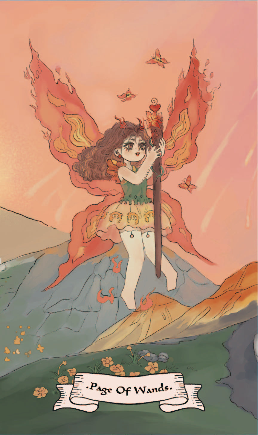 In the golden glow of sunset, the Page of Wands practices butterfly magic. She clasps a wand blooming with fiery blossoms in both hands, gazing at it with joy and concentration. Her gestures are still a little clumsy, but her earnest attitude and hunger for new knowledge shine brightly. Though inexperienced, her passion, sincerity, and natural talent promise fruitful growth with time. The Page of Wands symbolizes the youthful energy that arises when embarking on a new venture — a spirited eagerness to explore, learn, and act despite uncertainty. Though nervous at times, she steps forward bravely, ready to transform curiosity into experience and inspiration into action.