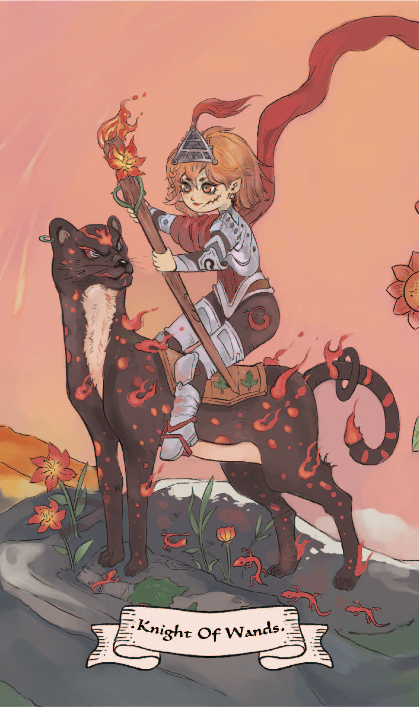 The Knight of Wands rides a blazing fire leopard, holding her wand high with radiant confidence. Her short, clean-cut hair accentuates her passionate nature, and her bright red garments bear the family emblem — the fire salamander. Yet, the salamander’s mouth does not touch its tail, forming an incomplete circle, symbolizing her journey toward maturity. Flames surge from the leopard’s body, embodying power, motion, and fierce vitality — just like her burning spirit and boundless enthusiasm. The Knight of Wands represents travel, change, and fiery momentum. As the fire within fire, this card embodies action, transformation, and the pursuit of one’s own purpose — a relentless drive to move forward, wherever passion may lead.
