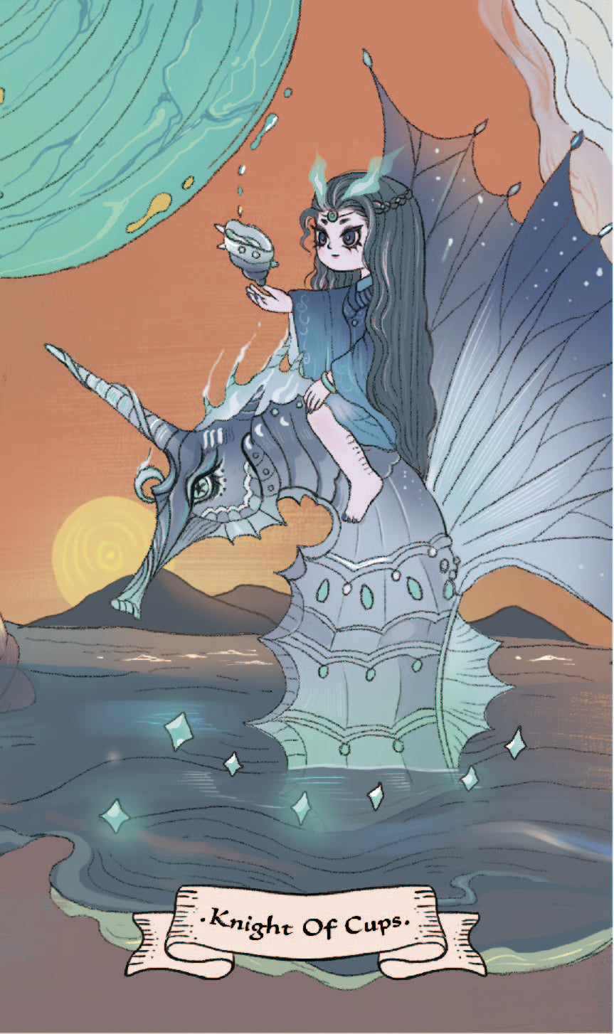 Upon a mirror-like sea, she rides a majestic sea creature with effortless grace. Her dreamy gaze lingers on the conch in her hand — she has slowed down now, seeking to “understand” a certain feeling and to comprehend her own emotions. The flickering water flame above her head symbolizes intuition and imagination, strong enough to overcome any obstacle that may stand in her way. The Knight of Cups often signals a moment of choice — whether to wait or to act, to allow things to unfold naturally or to pursue new possibilities. Perhaps now is the time to follow your heart.