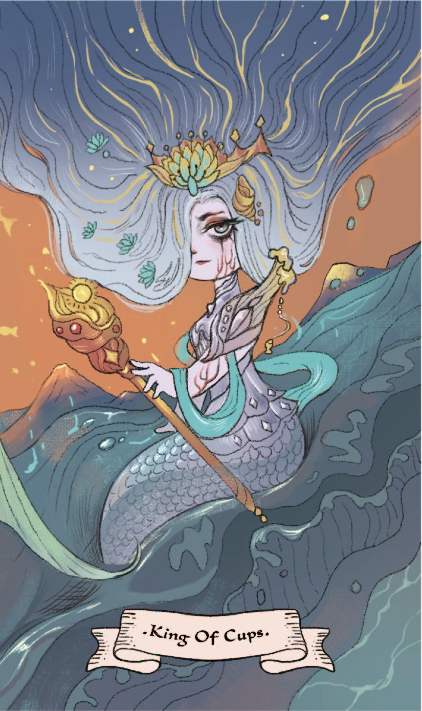 The King of Cups represents the grounded aspect of the water element — emotion stabilized by discipline. Her unwavering eyes reflect self-control and wisdom, enabling her to achieve continued success. She embodies the perfect balance between heart and mind, sensitivity and strength — a ruler who leads not by force, but by empathy and insight.