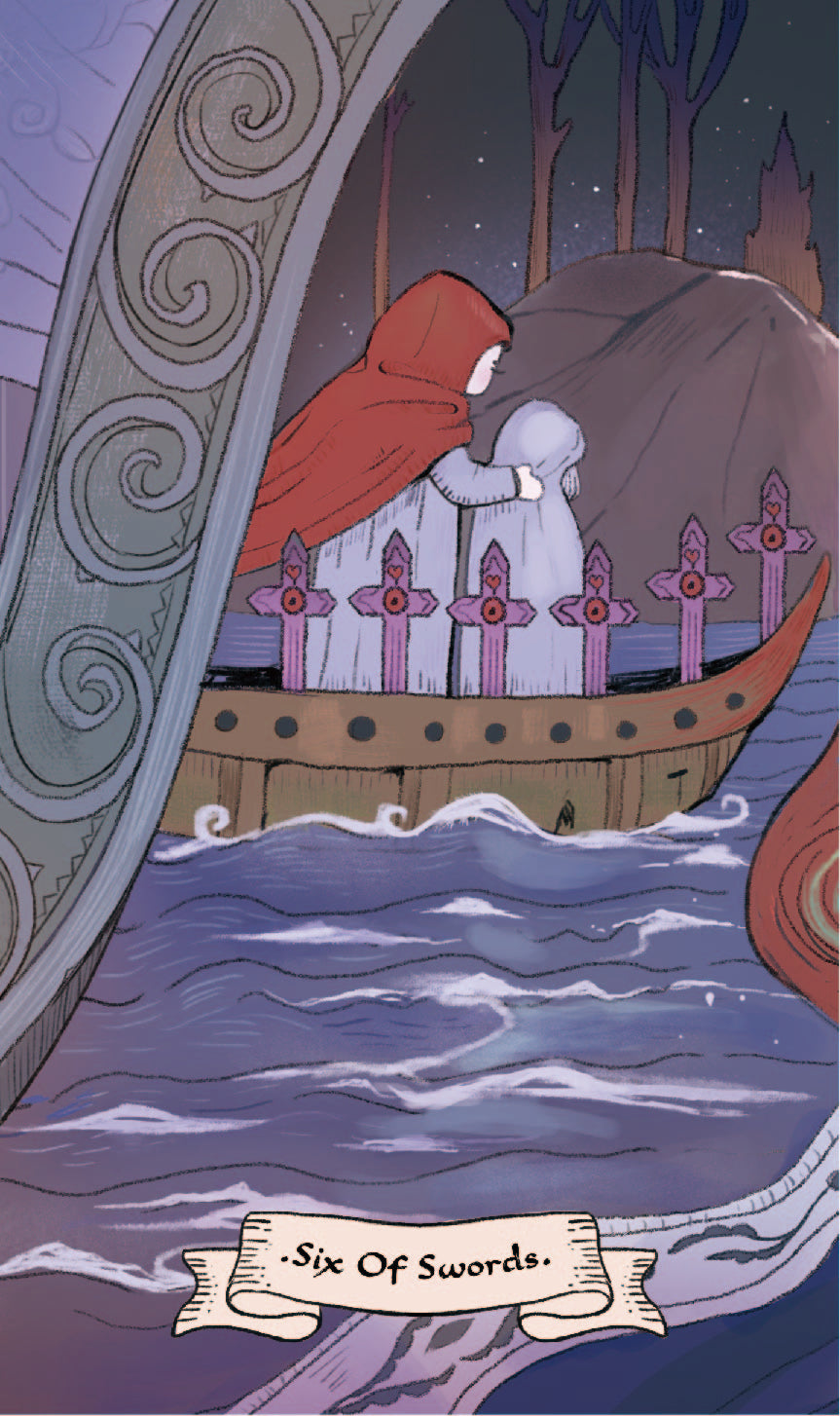 Across the vast sea, a small boat struggles toward calmer waters. A mother and child sit close together beneath their cloaks. Six swords are embedded in the hull, weighing it down — yet pulling them out would only worsen the danger. The burdened boat moves slowly, but with determination, they continue onward, believing they will pass through hardship and reach the hills and forests that lie ahead.