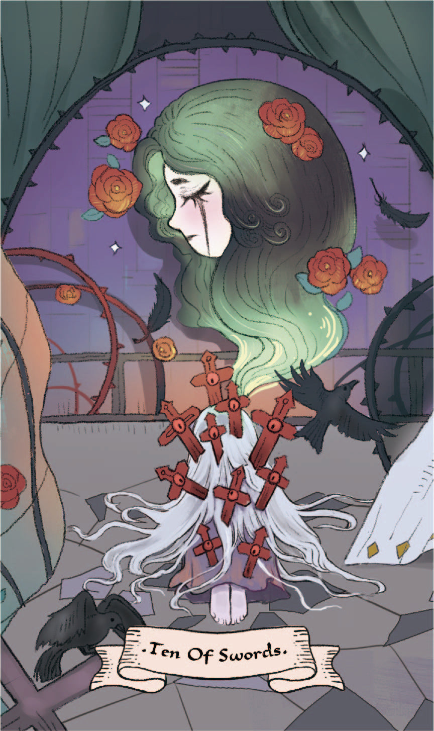 The Ten of Swords often carries very negative connotations — nearly every unpleasant word imaginable can describe its meaning. It marks the lowest point in life’s journey. Yet, as the crows rise and take flight beside the fallen girl, they signal that this darkest, most painful period is coming to an end, and new light is about to break through.
