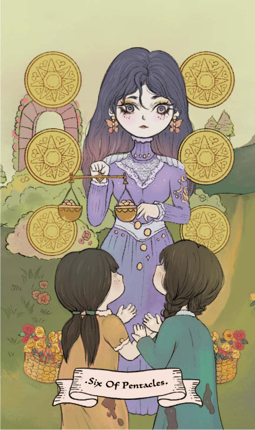 This card represents the flow of giving and receiving, often centered around material aid or generosity. In the image, even those in poverty find relief through the kindness of others — a brief but meaningful support. It speaks of charity, fairness, and the balance between abundance and need. However, the Six of Pentacles also questions the dynamics of this exchange: are you the one offering help, or the one receiving it? True generosity comes not from superiority, but from empathy and awareness. The lesson lies in understanding the balance — giving without pride, receiving without shame, and knowing that fortune’s scales may shift at any moment.