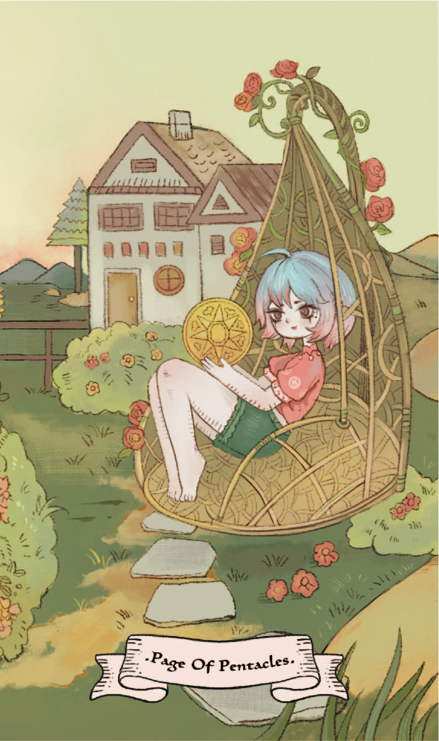 The Page of Pentacles represents a diligent apprentice — one devoted to study, practice, and steady growth. Unlike the Page of Cups, who learns through imagination, or the Page of Swords, who thrives on curiosity and analysis, this Page values tangible skill and grounded progress. She studies patiently, often reserved among peers, yet focused and determined. Her ambitions are realistic, her dreams built on structure and discipline. This card heralds a time of learning and preparation, a reminder that true mastery is earned through persistence, humility, and hands-on experience.